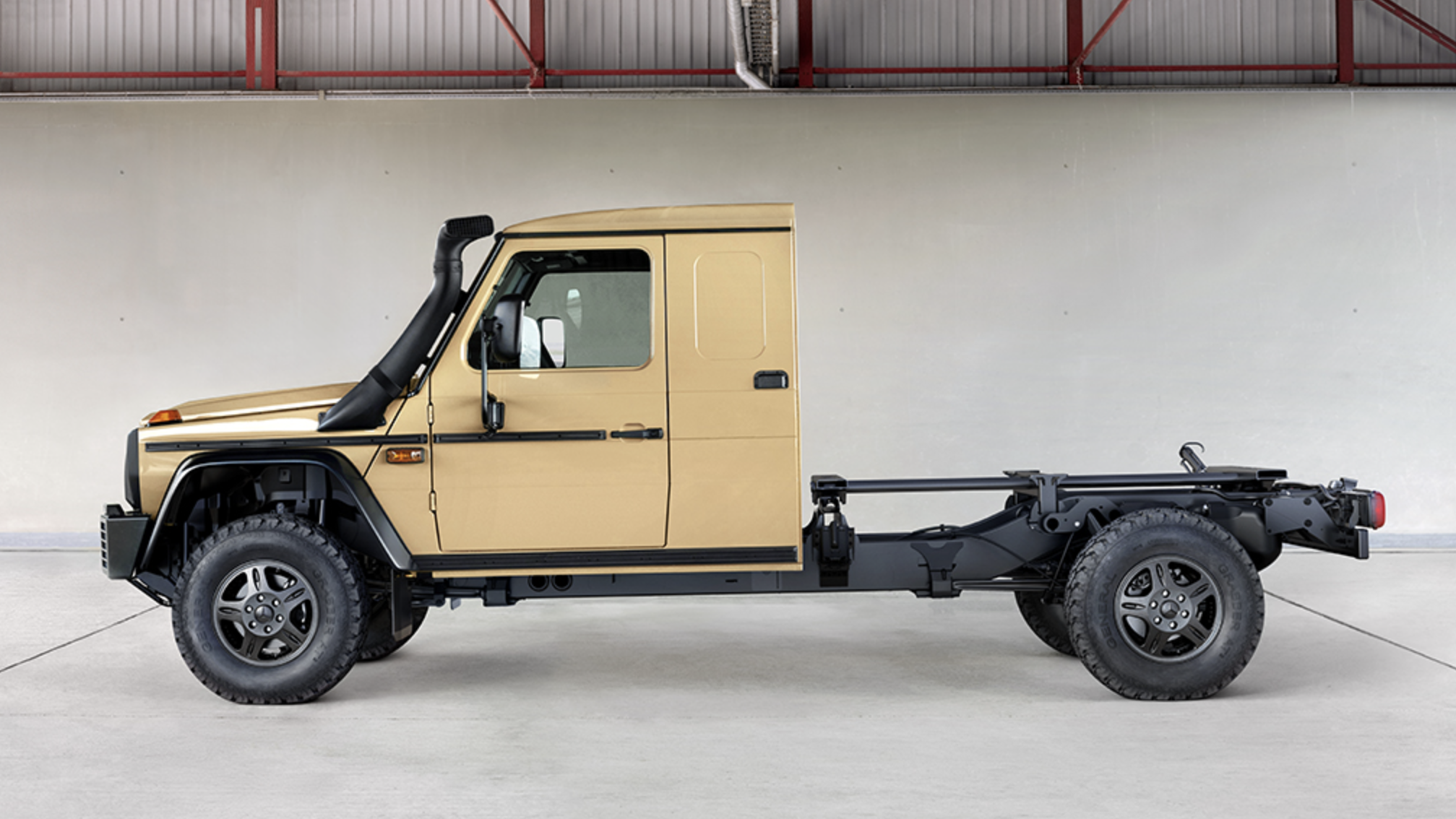The new four-door G350d will have a max payload of 2,200 pounds, but its roof can carry up to 440 pounds. The Chassis Cab's payload tops out at around 5,500 pounds. It'll be available either with a 21 or 25 gallon fuel tank to make "ranges of 600 kilometers [373 miles] easily possible," according to the carmaker.