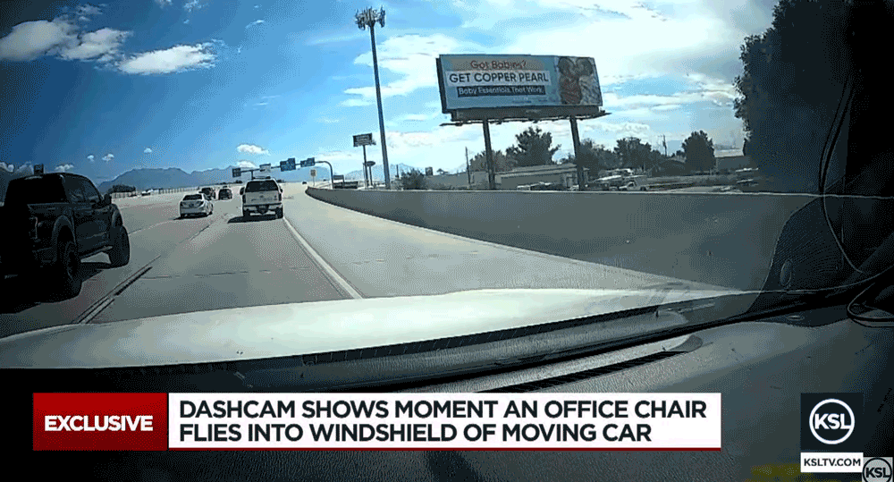 The errant, disembodied base of an office chair smashed into the windshield of a car along I-15 in Lehi, Utah. A family of five had gone out for tacos on the weekend only to be met by the spinning metal base of the chair, hurtling through the air like an overgrown ninja star. The incident was captured by the dash cam of the Eaton family car, the make and model of which is unclear.
