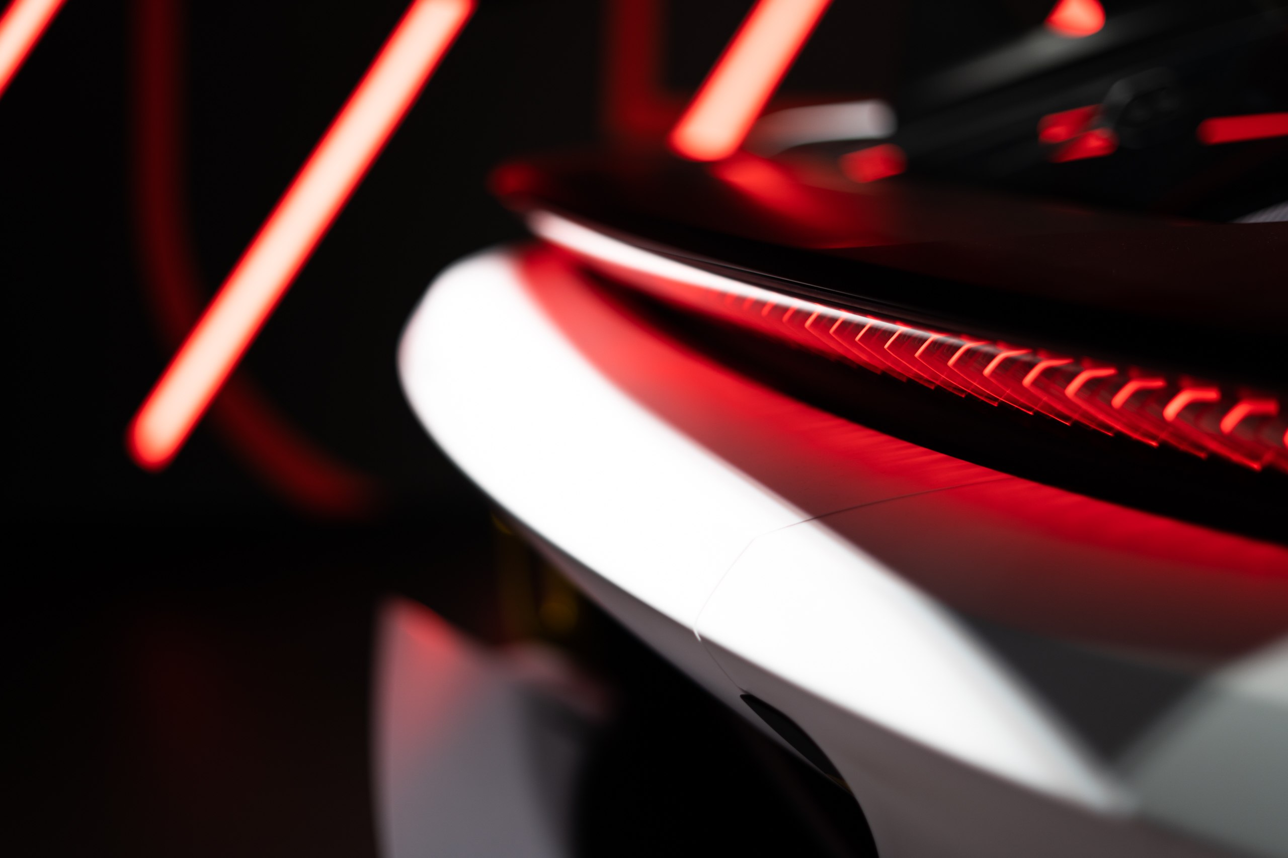 That's the Mission E's body-width tail light, which goes perfectly with the light strips Porsche had placed around their little display room. I'm telling you, this car is art.