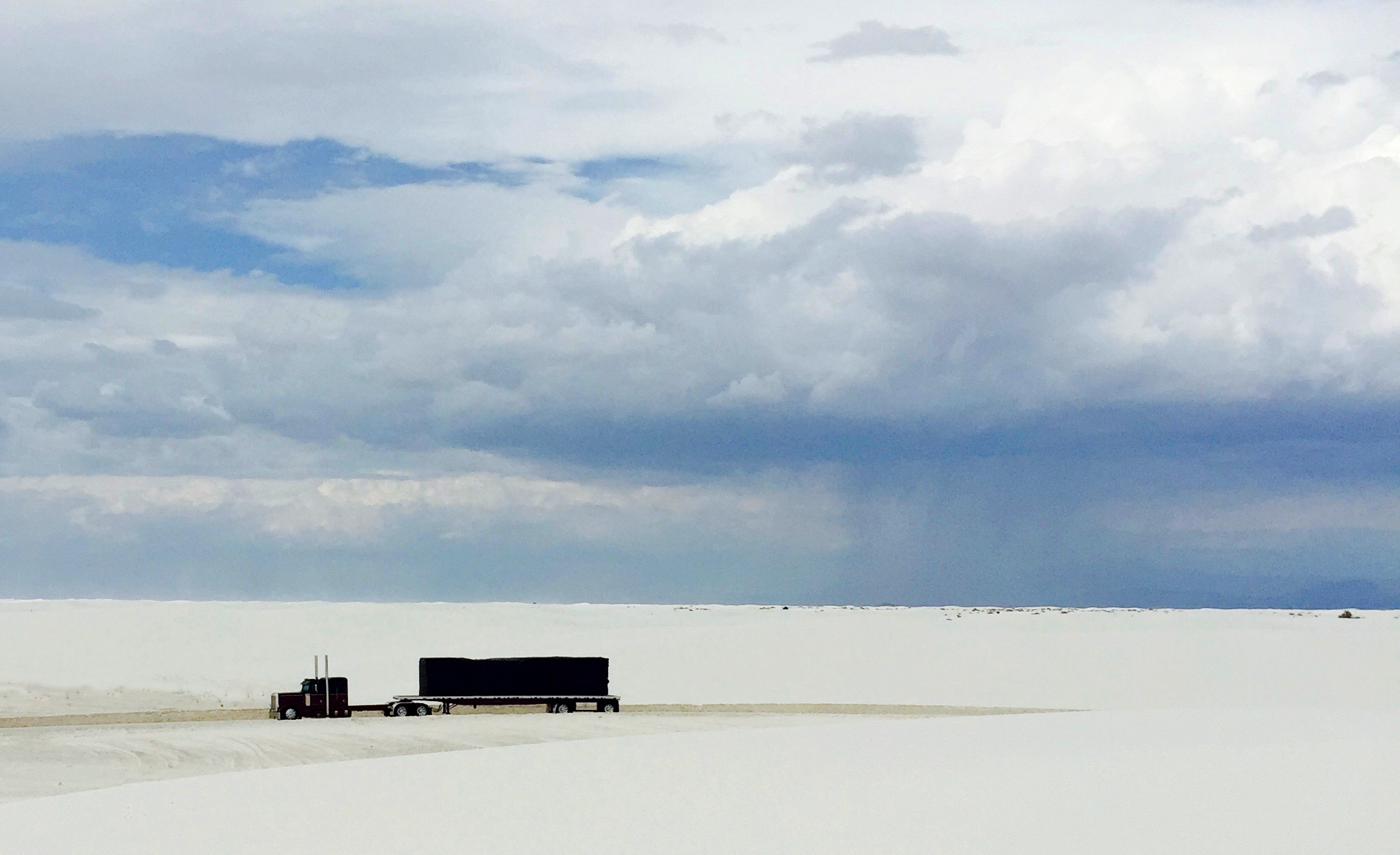JDT of Medford, Oregon, hauling wood products bound for Denton, Texas, parks inside the White Sands Monument Park in New Mexico where the opening scene to the movie Convoy was filmed in the 1970s.