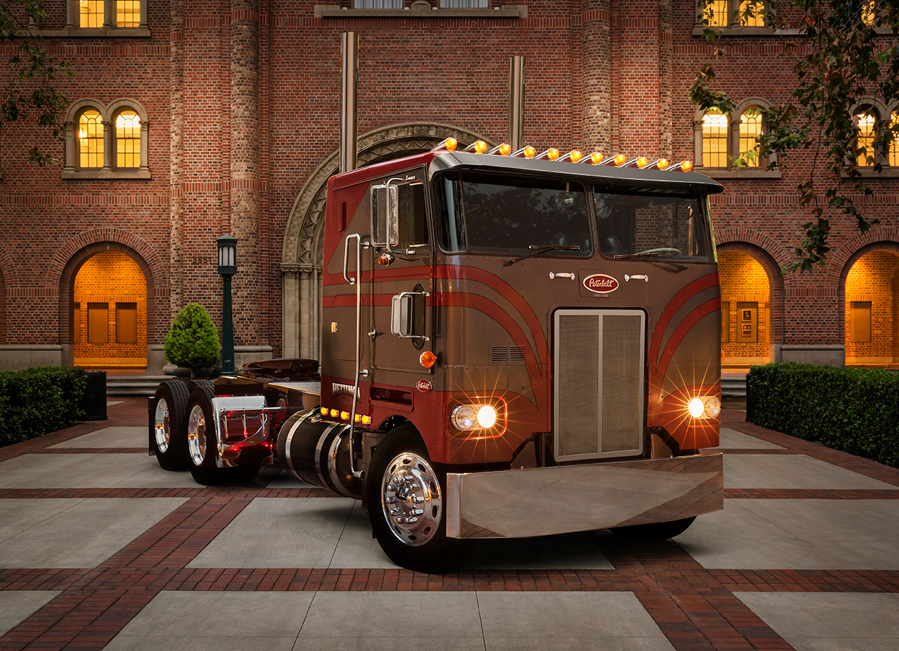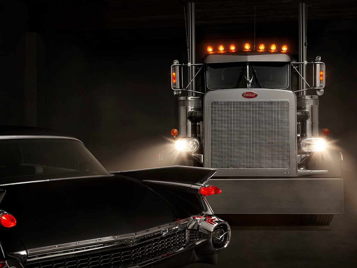 Classic Peterbilt 359 Truck photographed in a Burbank studio with the classic Cadillac whale tail fin in the foreground.