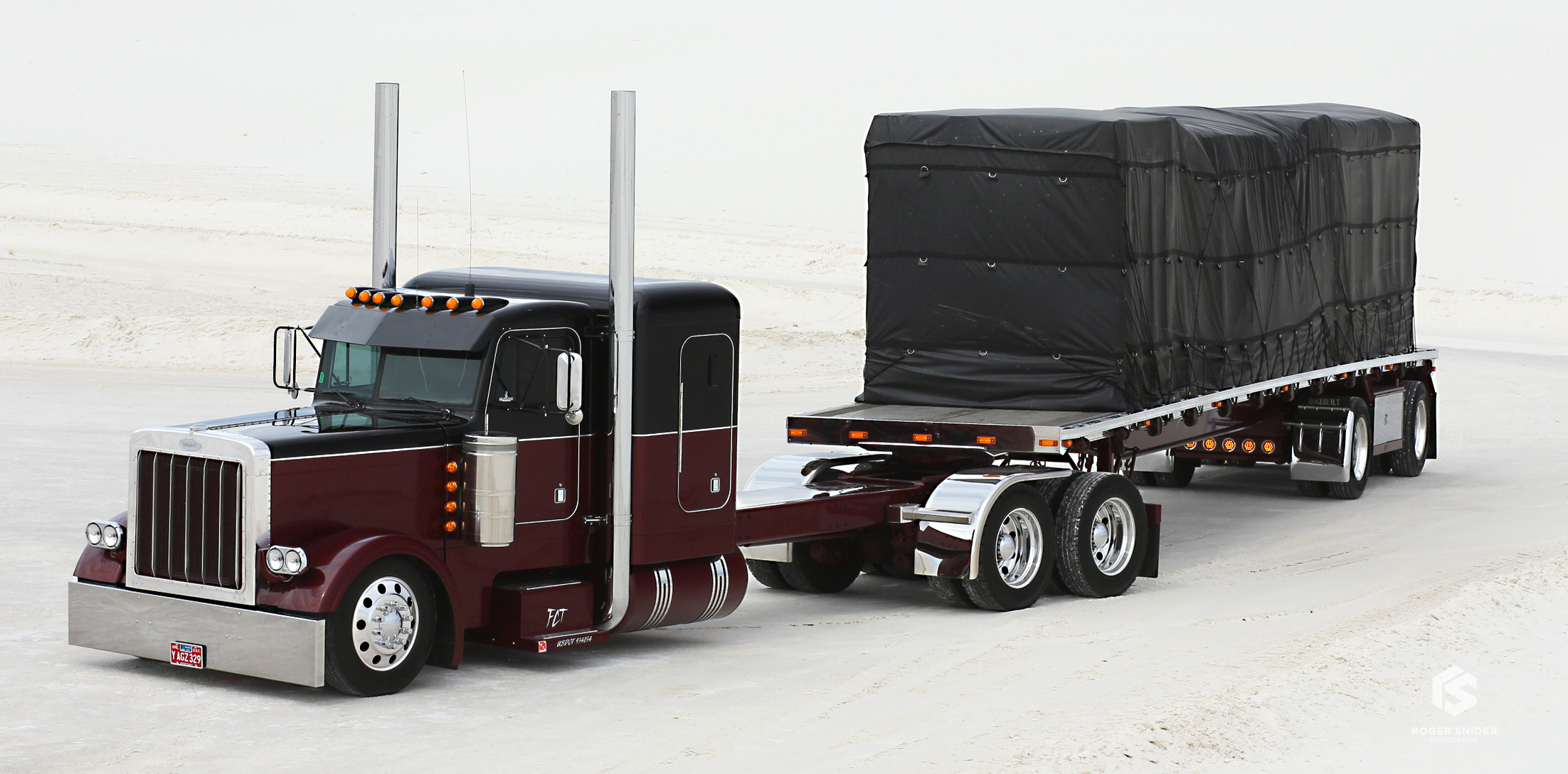 Slight overhead shot of the Peterbilt 379 of James Davis Trucking of Medford, Oregon, at White Sands Monument, New Mexico with a load of wood products headed to Texas.