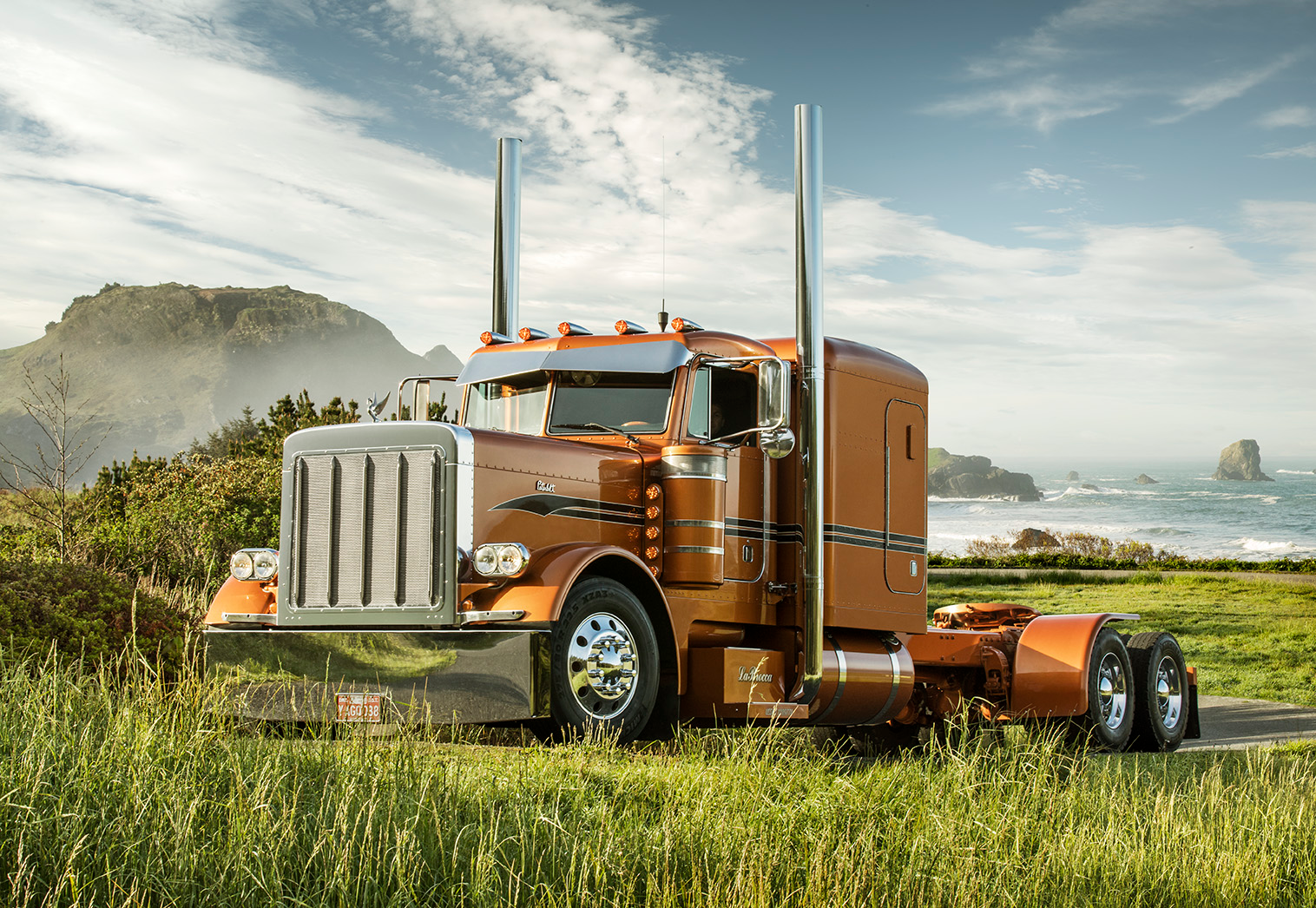 Dane Nelson's Peterbilt 389 at the UCSD Student Union. Calendar truck shoot in San Diego CA at golden hour.