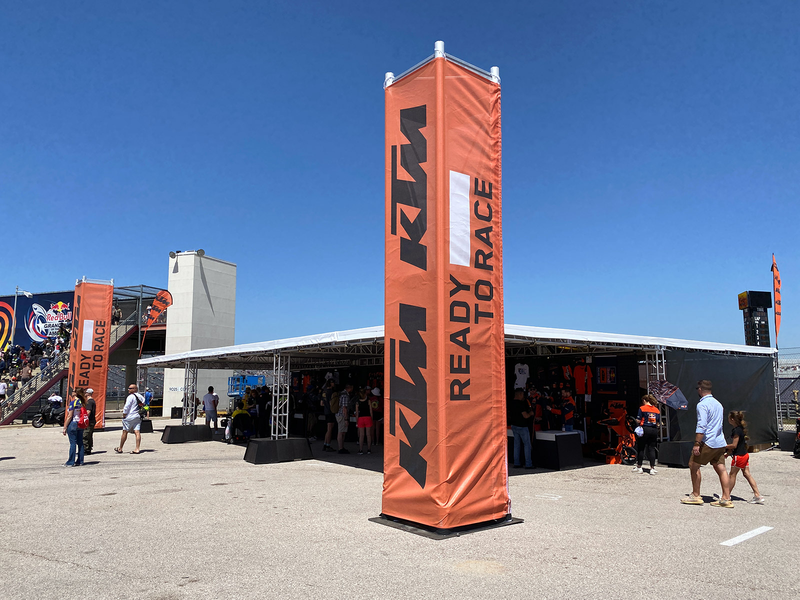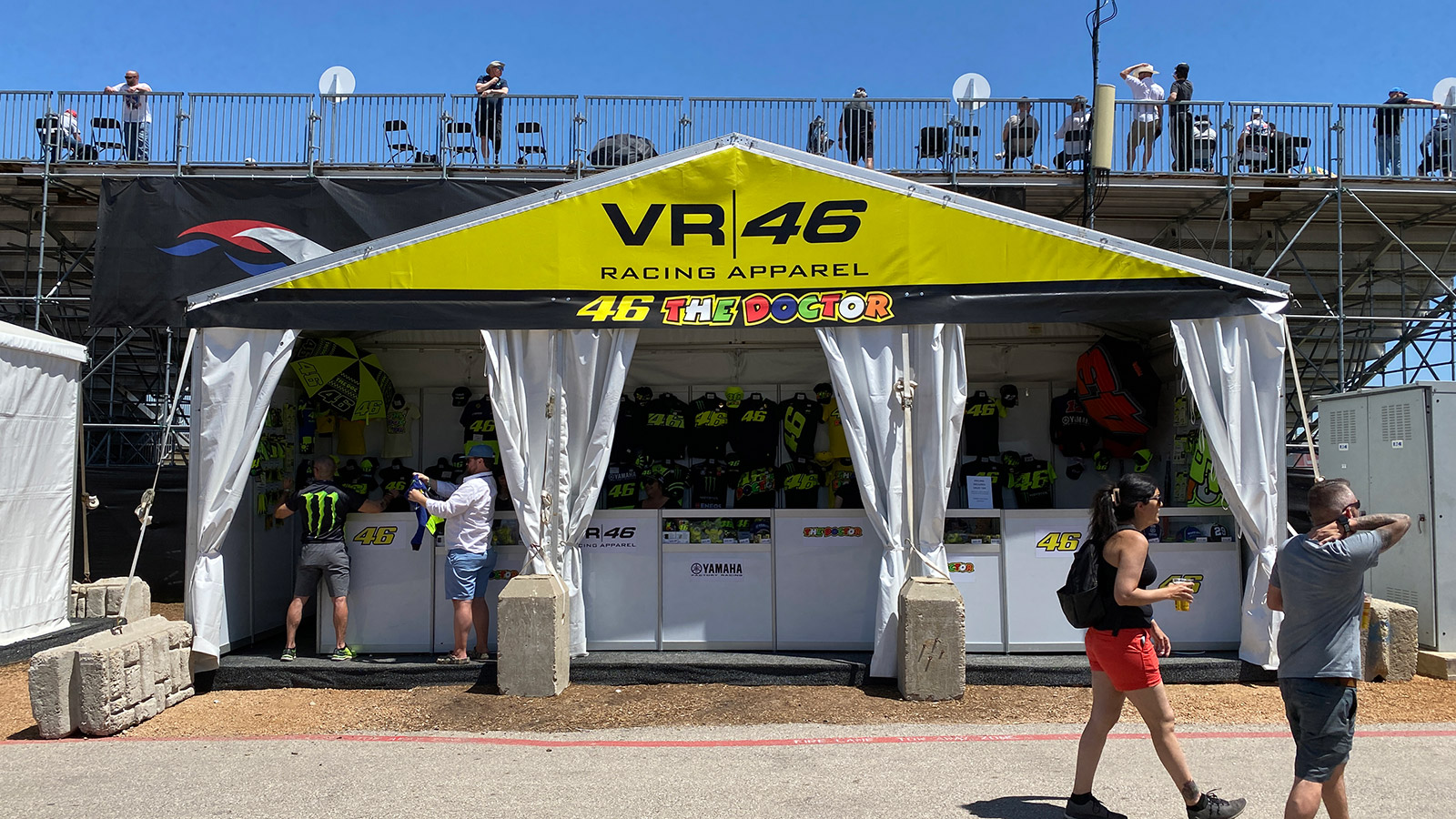 I could blindfold myself and walk into a VR46 stand — and that's saying a lot because COTA is fucking huge. Now, of course I love Valentino as so many of us do. The guy's personality is infectious and I was sad when he retired. But he doesn't even work here anymore. Elsewhere, Honda and Ducati unsurprisingly have a big presence. Yamaha, KTM and Aprilia less so, though those tents exist if you know where to look.