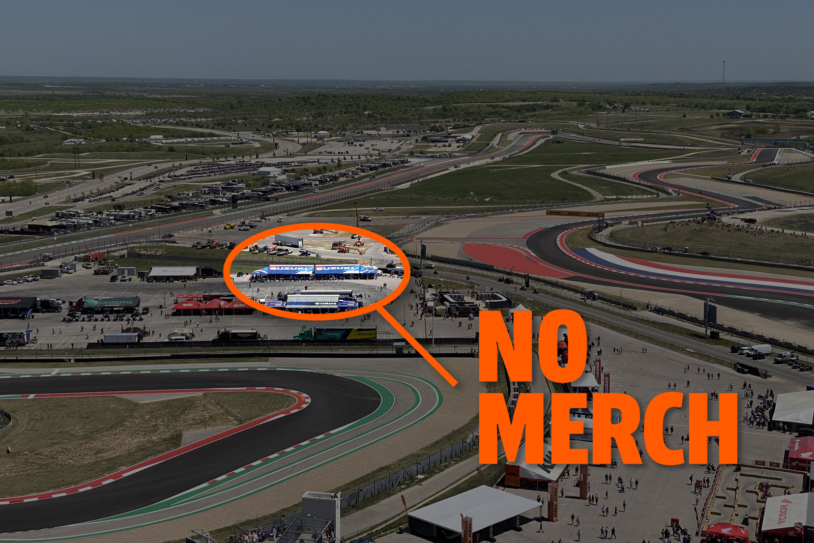 Strangely there is a big Suzuki tent in the infield between turns 5 and 13. I spotted this from COTA's famous observation deck, which I have internally nicknamed "space penis." Like seeing a mirage under the Texas sun, I thought my prayers had been answered. But when I made it to the tent, there were only motorcycles to demo and a single hat with the Hayabusa logo on it that may not have even been for sale. Nothing representing the team, nothing with Joan Mir's nor Alex Rins' names on it.