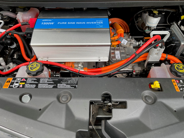 It [runs] the fridge, fiber modem, two Macs, monitors, iPads and iPhones. All thanks to the car's 66kWh battery. Now we've got power to keep me working off-grid for at least eight days and at the same time holding the cabin fridge running, some light, etc... Between the 1.5kW pure sine wave inverter and cables and home-made 3D parts and tinkering, it sat me back about USD $500.