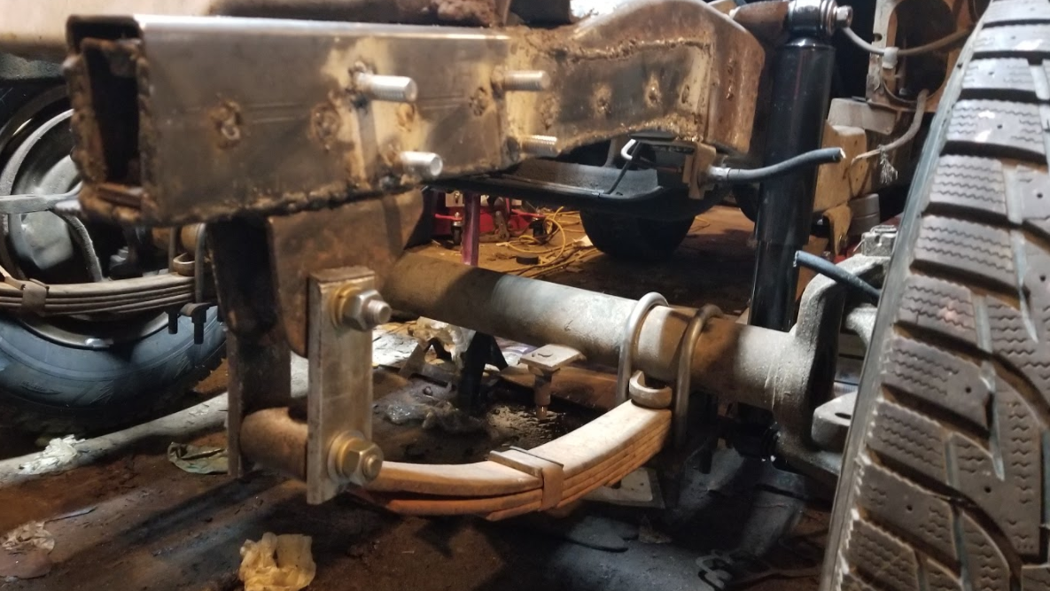 With the shackles cut and drilled, the U-bolts holding the axle to the springs, and the bushings in place, a reader named Liam—a Jeep fanatic and YouTuber—and I slid the axle under the Jeep, bolted everything up, and installed my new shocks.