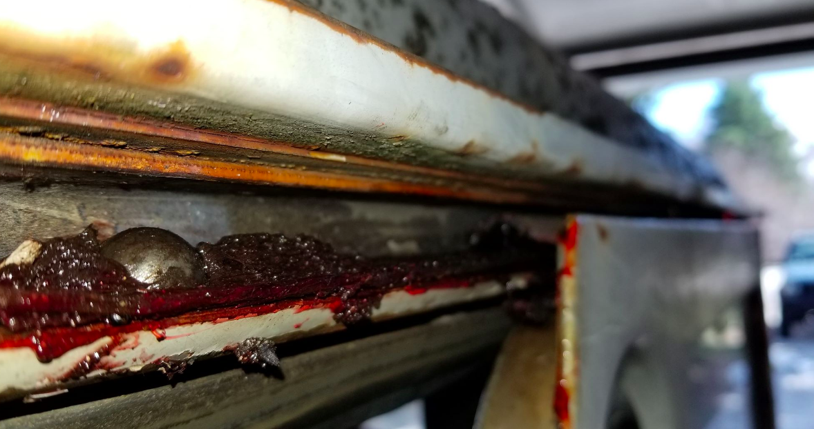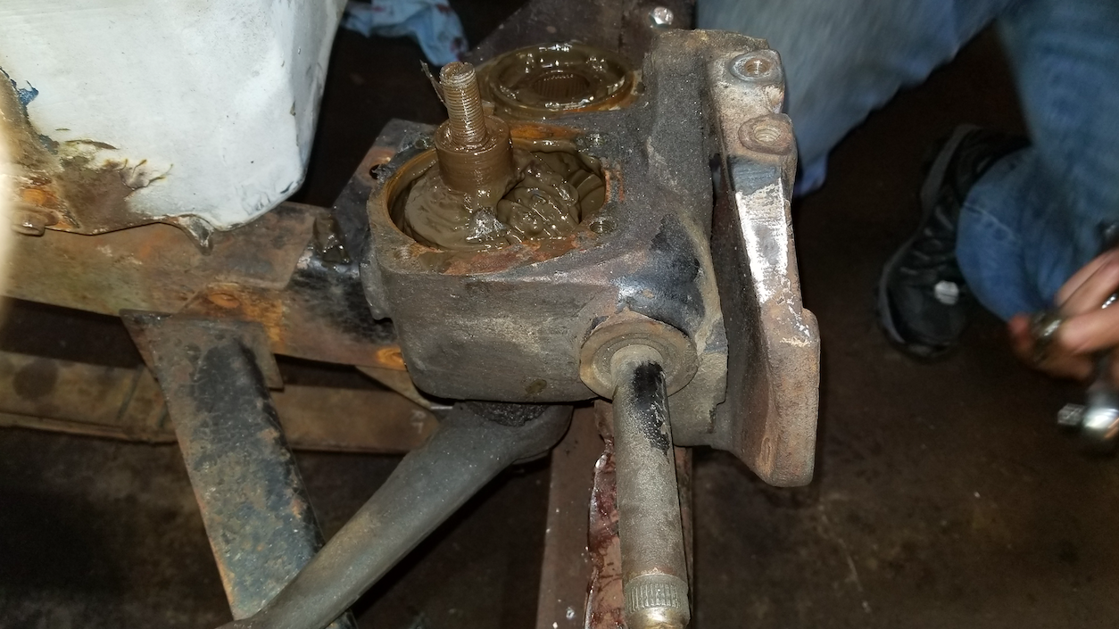 Upon inspecting the innards of the steering box, Charles and I saw that the gears looked mostly fine, but there was a decent amount of shiny silver paste that looked very much like ground-down steel. You can see that below—it looks quite different from the rest of that brown grease: