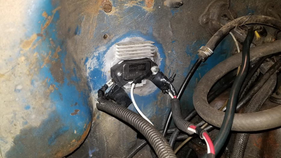 Speaking of the HEI ignition, last weekend, I ran to the junkyard and picked up a heat sink for the GM ignition module out of a Chevy Silverado. My friend Eric cleaned Project POStal's firewall, drilled a few holes into it, slapped the module onto the heat sink (whose front and rear we'd leathered with thermal paste), and bolted it down. The result looks elegant (well, for this vehicle):