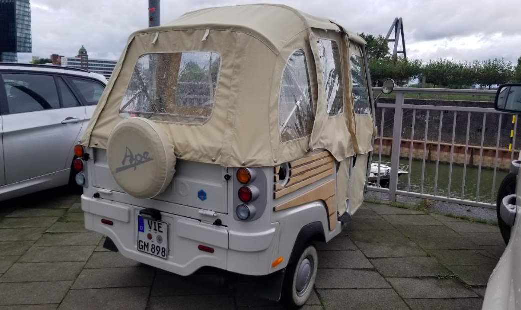 More importantly, how about the awesome, covered, wood-paneled Piaggio Ape out front?: