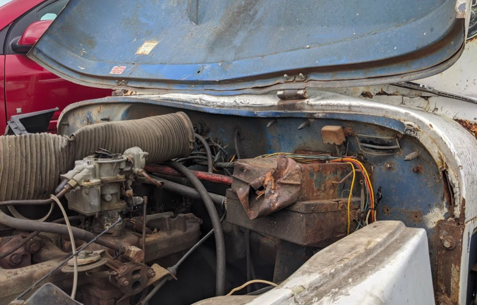 Reader "shop-teacher" also went out to the junkyard to check out the vehicle he'd read so much about on Jalopnik, and he took a bunch of photos. This image shows that the heater box has been crumpled, and the air cleaner lid hold-down on the top of carburetor is bent. (The air cleaner is in the back of the Jeep).