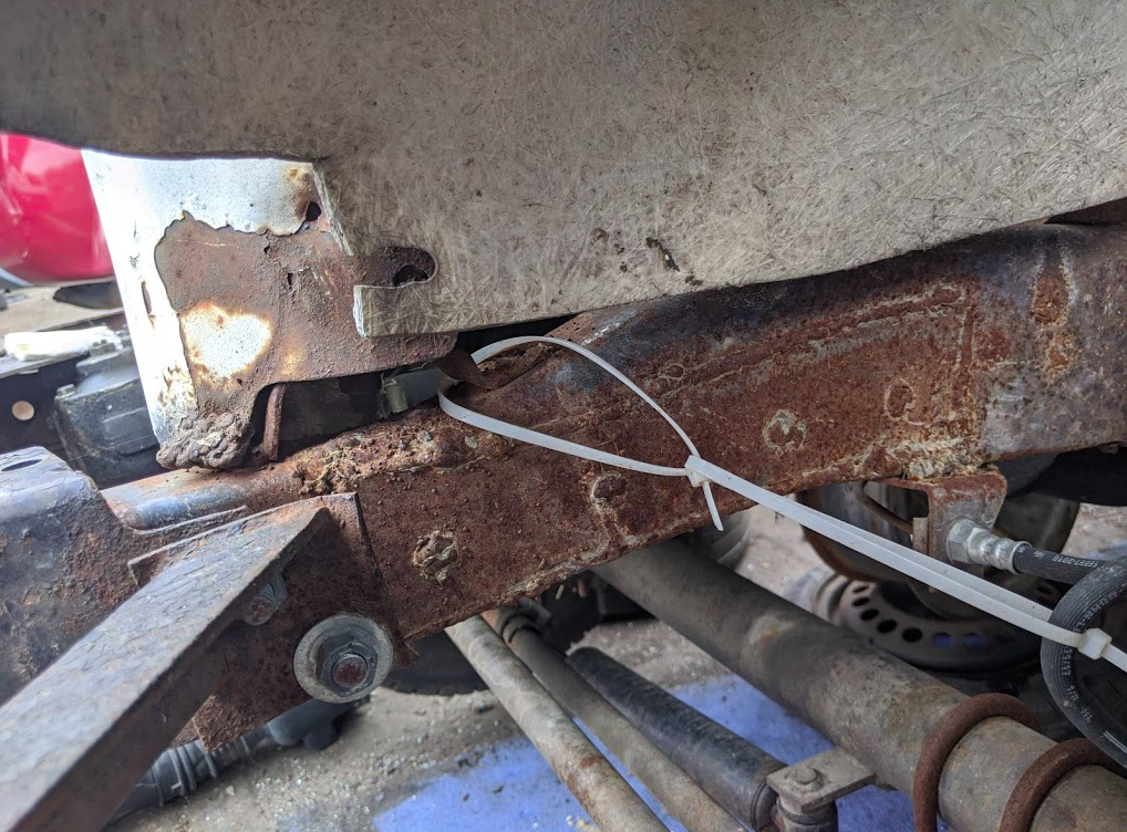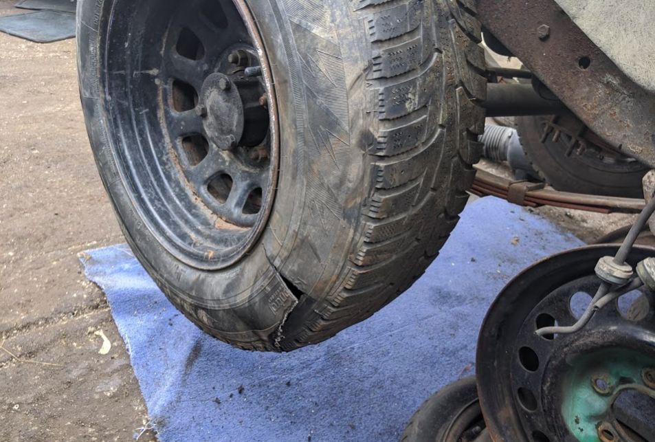 I see the custom front shackles that I fabricated out of a 1/8" thick steel bar. I see the 215/75R15 Hankook winter tires on Ford truck wheels. I see a bit of the aluminum tape on the side cabin air vent from when I tried closing it off to keep wind and rain from freezing me as I drove through Ohio to Illinois.