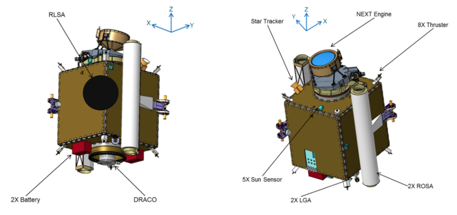 The DART spacecraft is a boxy, ion-engined kinetic impactor with interesting roll-out solar panels, and looks like this: