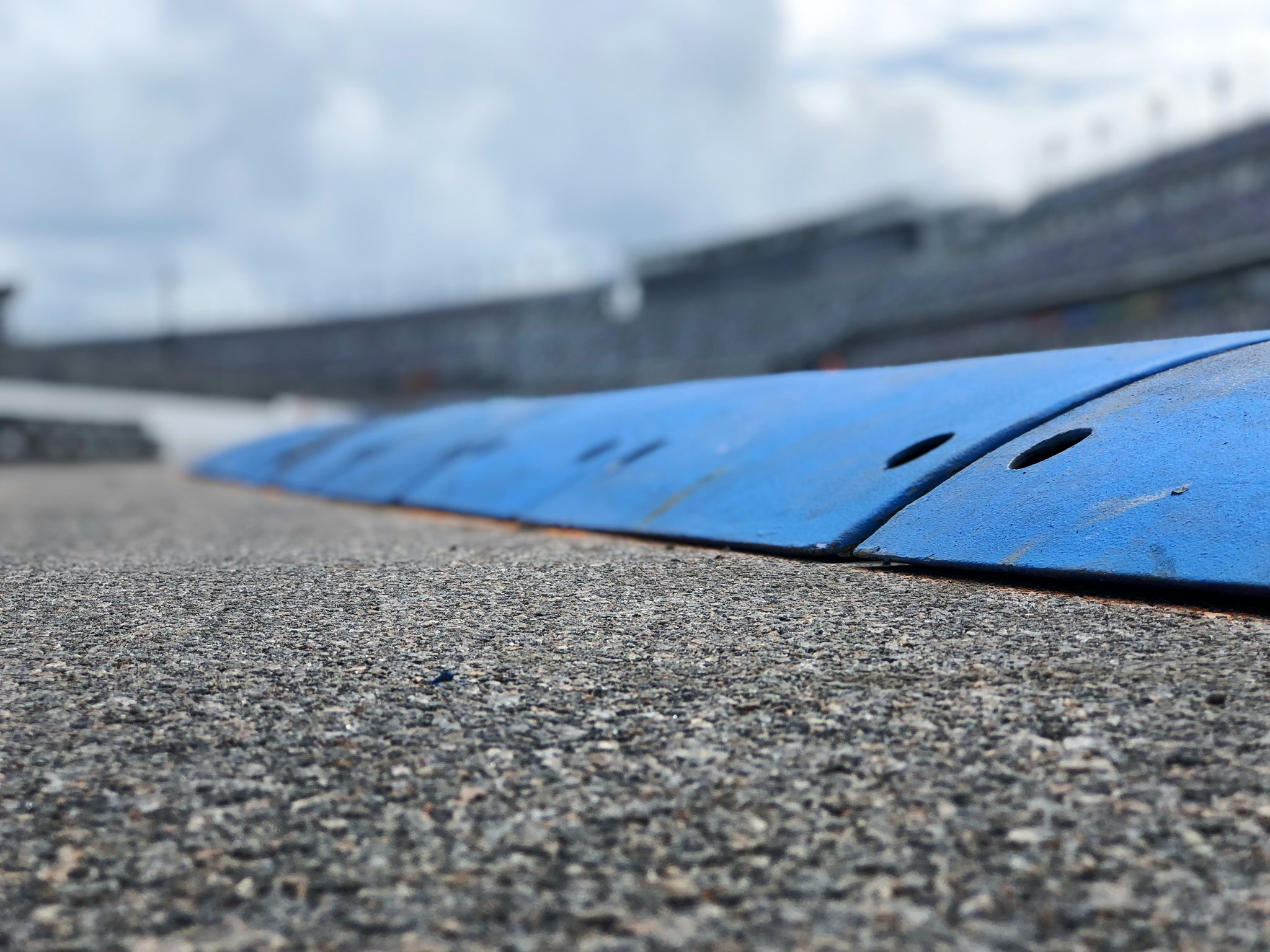 The chicane, pictured above, shows some pretty aggressive curbs placed at the apex. These mountainous curbs are expected to cause some pretty serious suspension damage if drivers wail into them at high speed. Giving consideration to how often these stock car boys bash into each other, I wouldn't be surprised to see these big blue blocks used as weapons during the Daytona race, particularly on the final lap as racers jockey for position in the final run to the line.