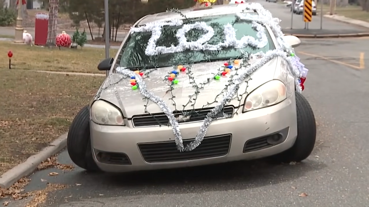 Besides the tinsel, stockings and Christmas lights mysteriously hung on the car, there were also gift bows and a sign crudely taped to the rear glass. The tinsel spelled out "TOW," while the note read "Abandoned! Please tow for X Mas." It was signed "The Neighborhood," but no residents took credit for the stunt in the KDVR segment.