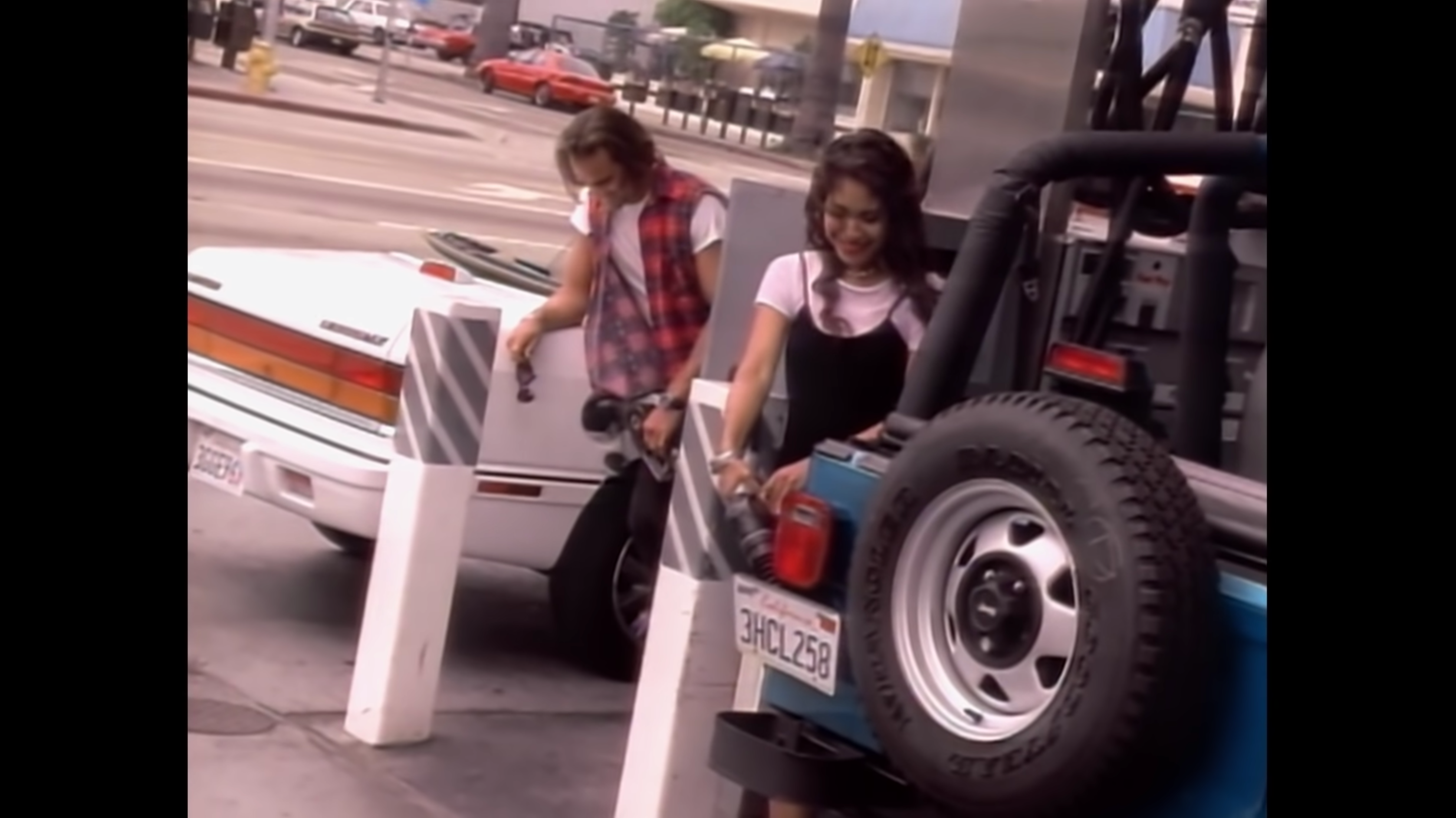 Both examples are set inside letter-boxed video, and the '90s are barely contained inside their 4:3 formatted screens. The first is the video for Selena's "Bidi Bidi Bom Bom," released in 1994. The title is referring to a thumping heart, but we know it's just the sound the video's LeBaron makes when it honks and backfires overtaking slower drivers.