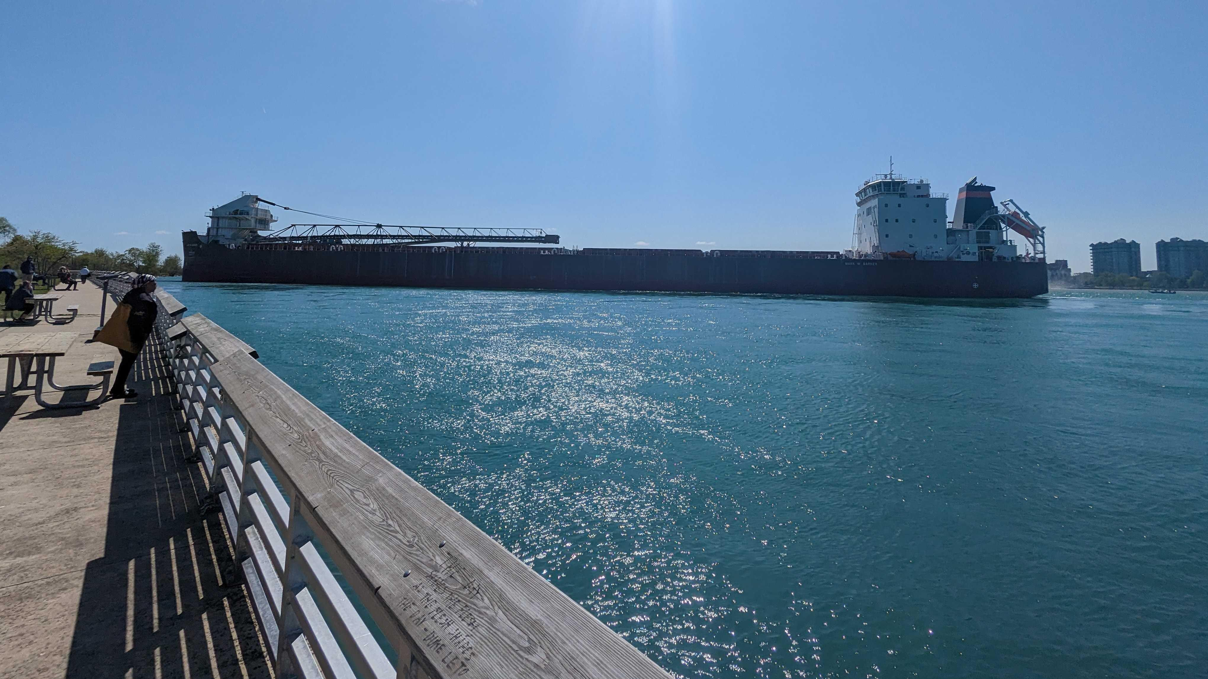 While the Barker was laying sideways across the straight between Belle Isle in Detroit and Windsor, Canada, the shipping channel was still navigable for other freighters with the help of a tug boat. The Coast Guard managed to tow the Barker out of the mud a little before noon, taking her backwards the wrong way up the shipping channel.