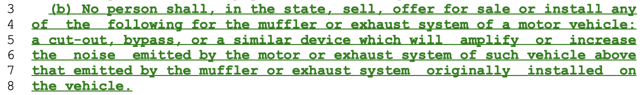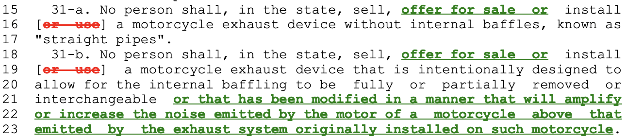 The SLEEP bill's update adds a few more infractions. It's now illegal to "sell, offer for sale or install" any cut-outs, bypasses, similar devices, or exhaust systems that increase the volume of a car in any way. Amusingly, the update also removes some infractions: It now seems to actually be legal to run a louder aftermarket exhaust on a motorcycle, at least under a strict reading of the law, provided you don't install it yourself.