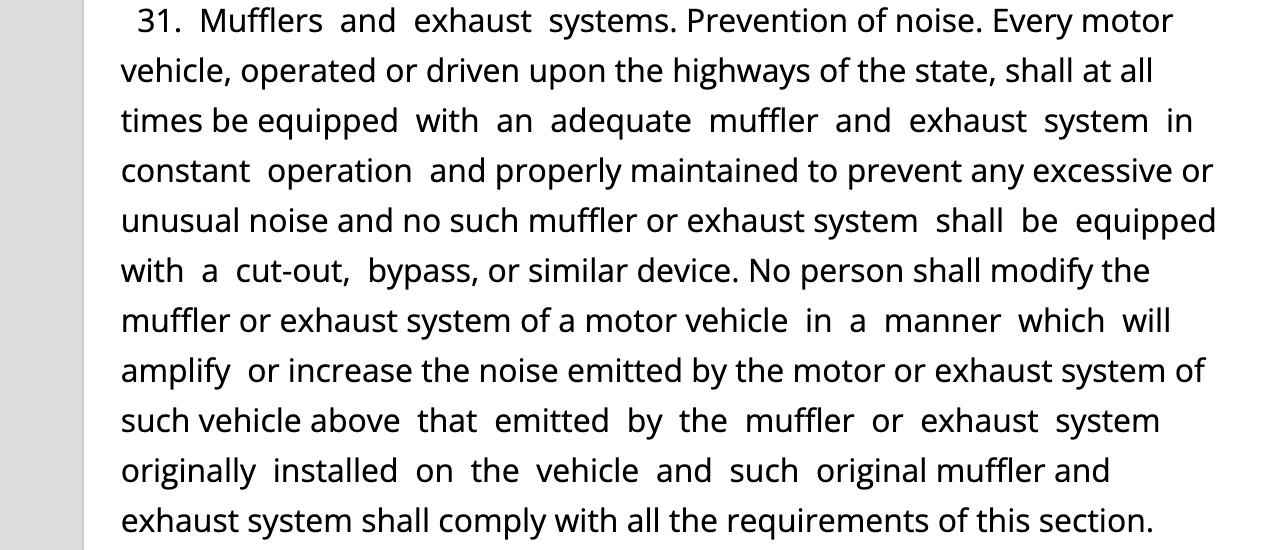 To start, what is the SLEEP bill? It's the schlocky backronym name for NY Senate bill S784B, an amendment to the state's laws regarding vehicle equipment — specifically, laws regarding exhausts. The existing law already bans any exhaust with "a cut-out, bypass, or similar device", or anything that "will amplify or increase the noise emitted by the motor or exhaust system of such vehicle above that emitted by the muffler or exhaust system originally installed on the vehicle." God, writing this kind of legalese sounds like soul-crushing work.
