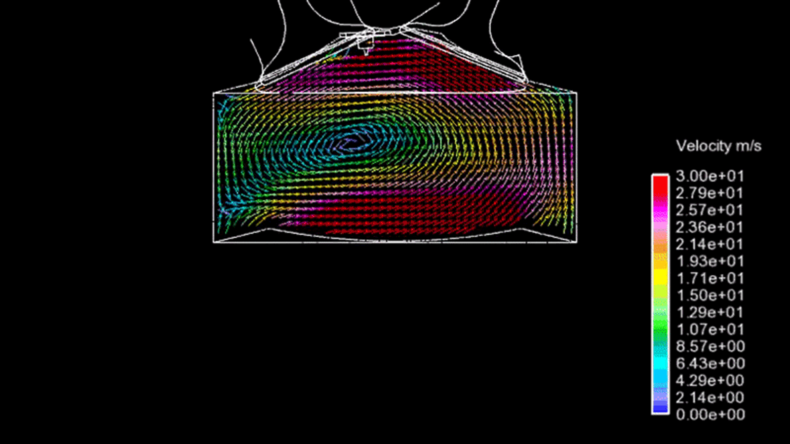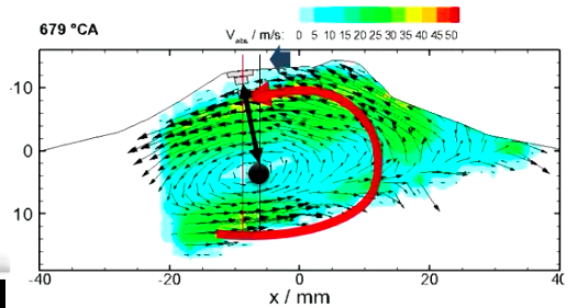 Typically, achieving such precise flow is achieved through optimizing the shape of the intake ports/valves and piston crown. Here's a look at combustion chamber fluid velocity vectors: