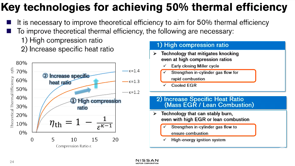 Nissan says that, in its internal testing, was able to achieve a thermal efficiency of 43 percent using exhaust gas recirculation and 50 percent by operating the engine at a fixed rpm, fixed load, along exhaust gas recirculation.