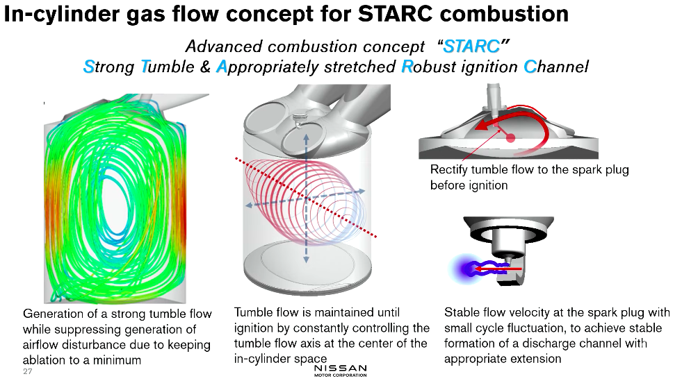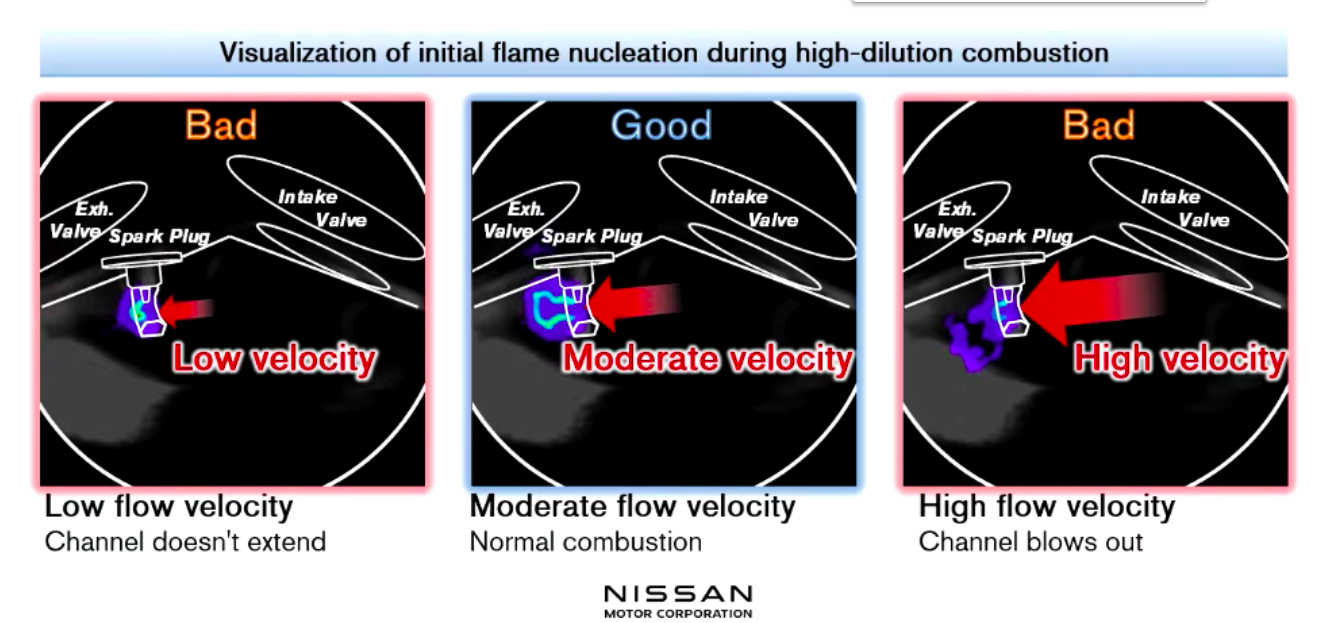 Nissan provides the visual below to drive home the importance of stable, precise fluid flow across the spark plug in the nucleation of a strong initial flame front, which is necessary for complete combustion, especially of diluted mixtures and especially with high compression ratios (both of which allow for improved efficiency, per the slide above).