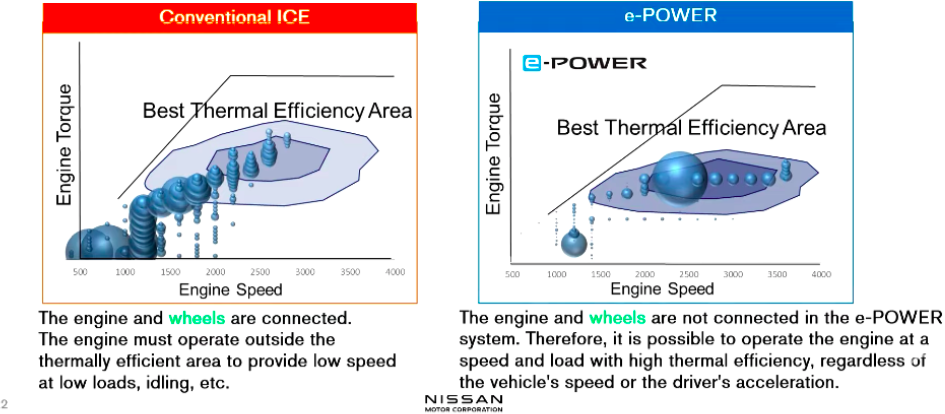 Conventional internal combustion engine (ICE) vehicles demand power and performance from an engine under a wide range of speeds (RPMs) and loads. This fundamental requirement means conventional engines cannot perform at their optimal efficiency at all times. However, Nissan's e-POWER system utilizes an on-board engine as a dedicated electricity generator for the system's e-powertrain. Operation of the engine is limited to its most efficient range, appropriately managing the engine's electricity generation and the amount of electricity stored in the battery.
