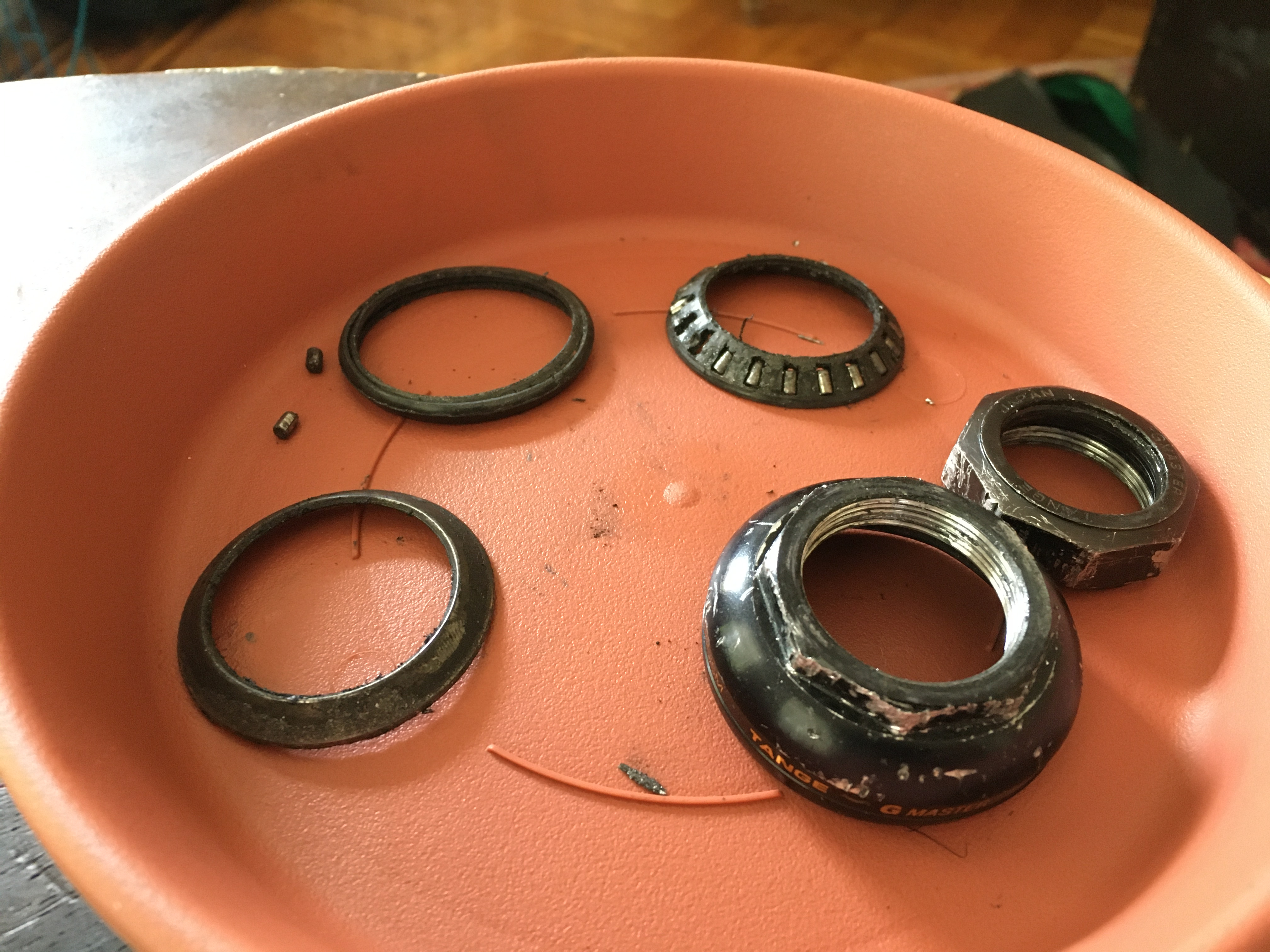 I was glad I did. Loosening the top nut all the way off the threaded fork was easy, revealed two sets of cracked bearings. These roller bearings sit on cone-shaped races, and they were crushed as well, along with clamped-down rubber-and-metal grease guards. My shit was toasted.