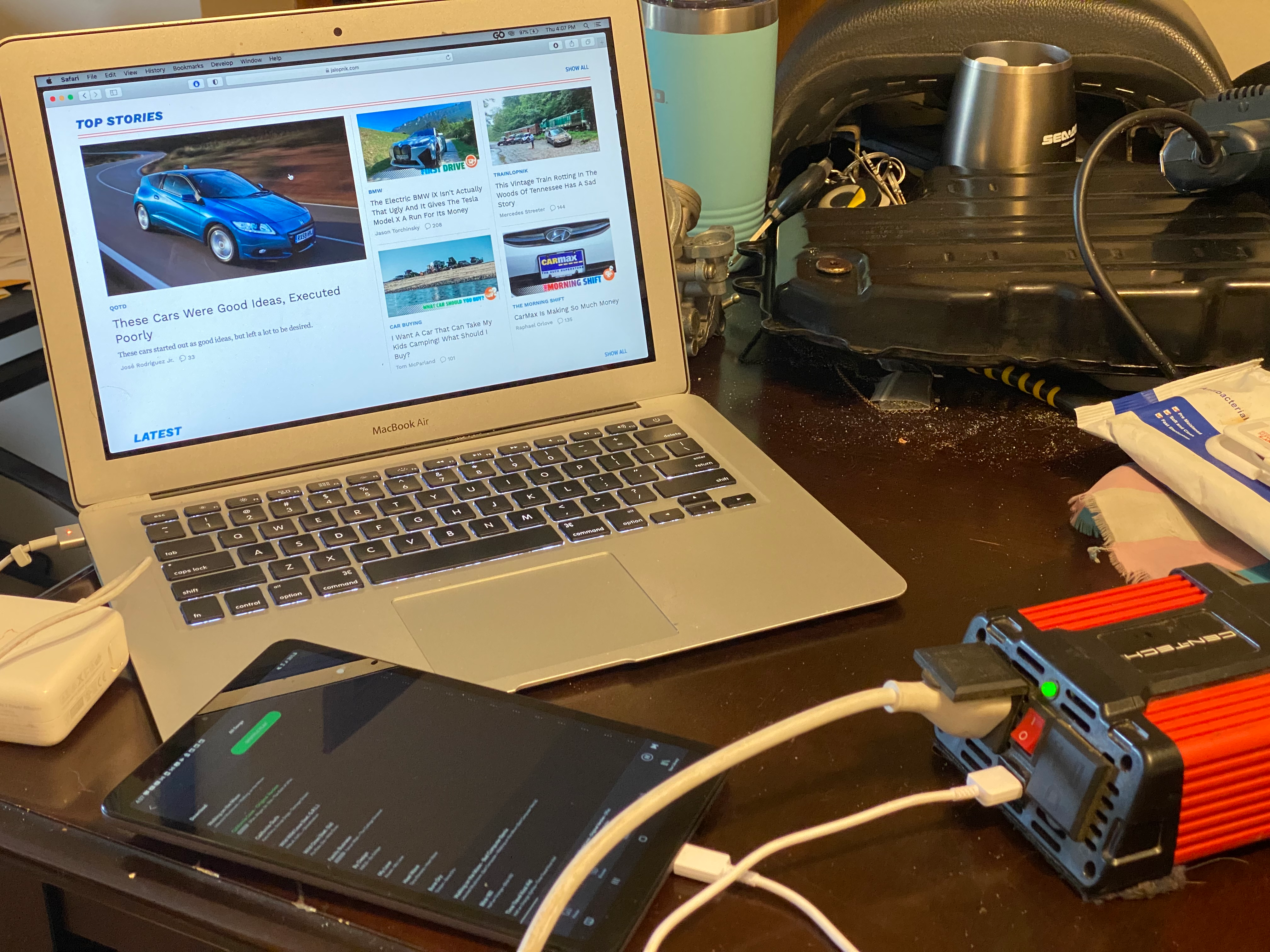 This is a pretty low power demand with the MagSafe charger taking 45 Watts and the tablet sipping 10 Watts. This leaves behind some room for stuff like lights, a mini cooler, or even a small workstation computer.
