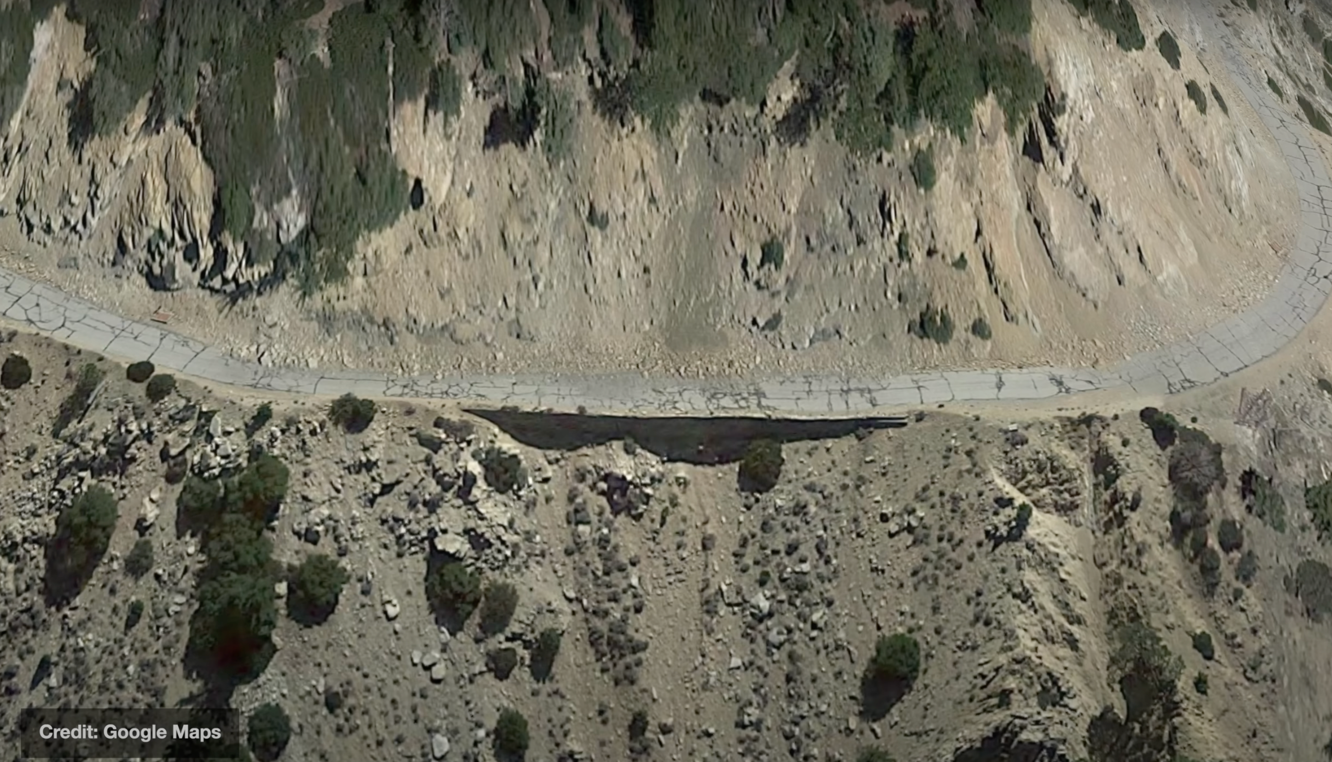 Even just a few feet into exploring the abandoned highway it's clear as day why the road remains closed: rock falls and landslides make this stretch hazardous. Google satellite view shows just how treacherous Highway 39 has become.