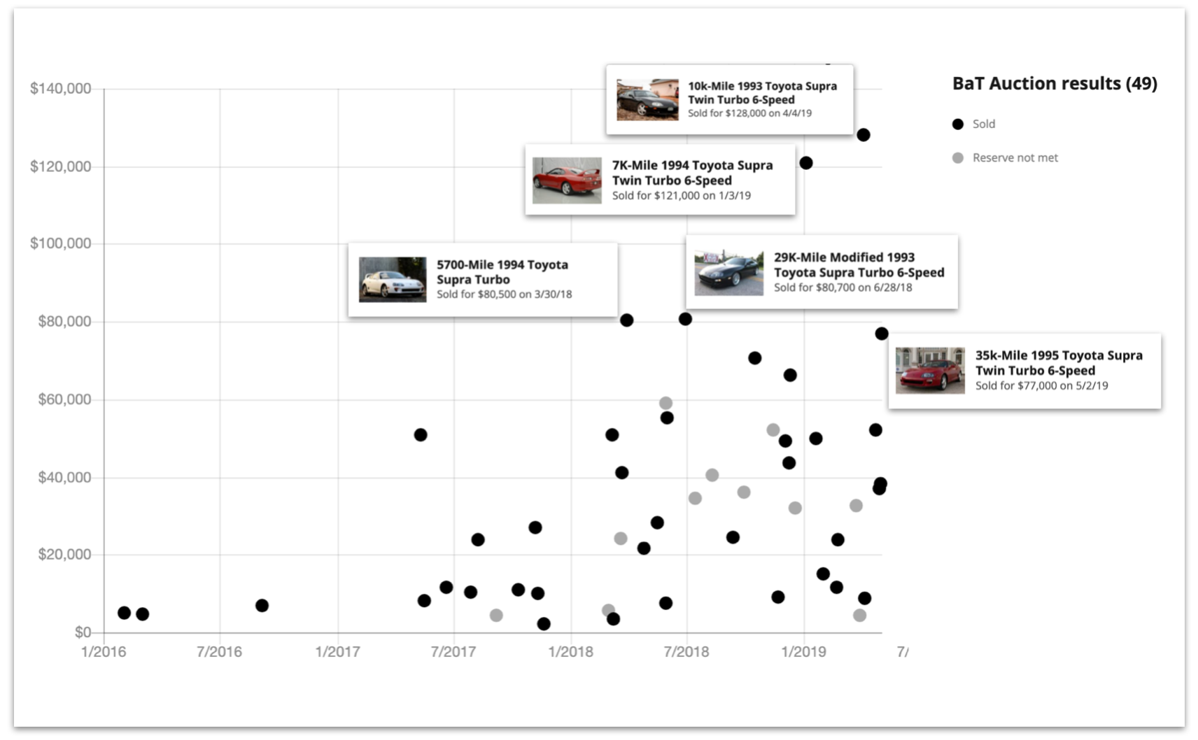The five highest Supra sales on Bring a Trailer are all fourth-gen models that sold within the past year or so, even, ranging from $77,000 to $128,000. That doesn't even include the RM Sotheby's auction of a 1994 Supra for $173,600.
