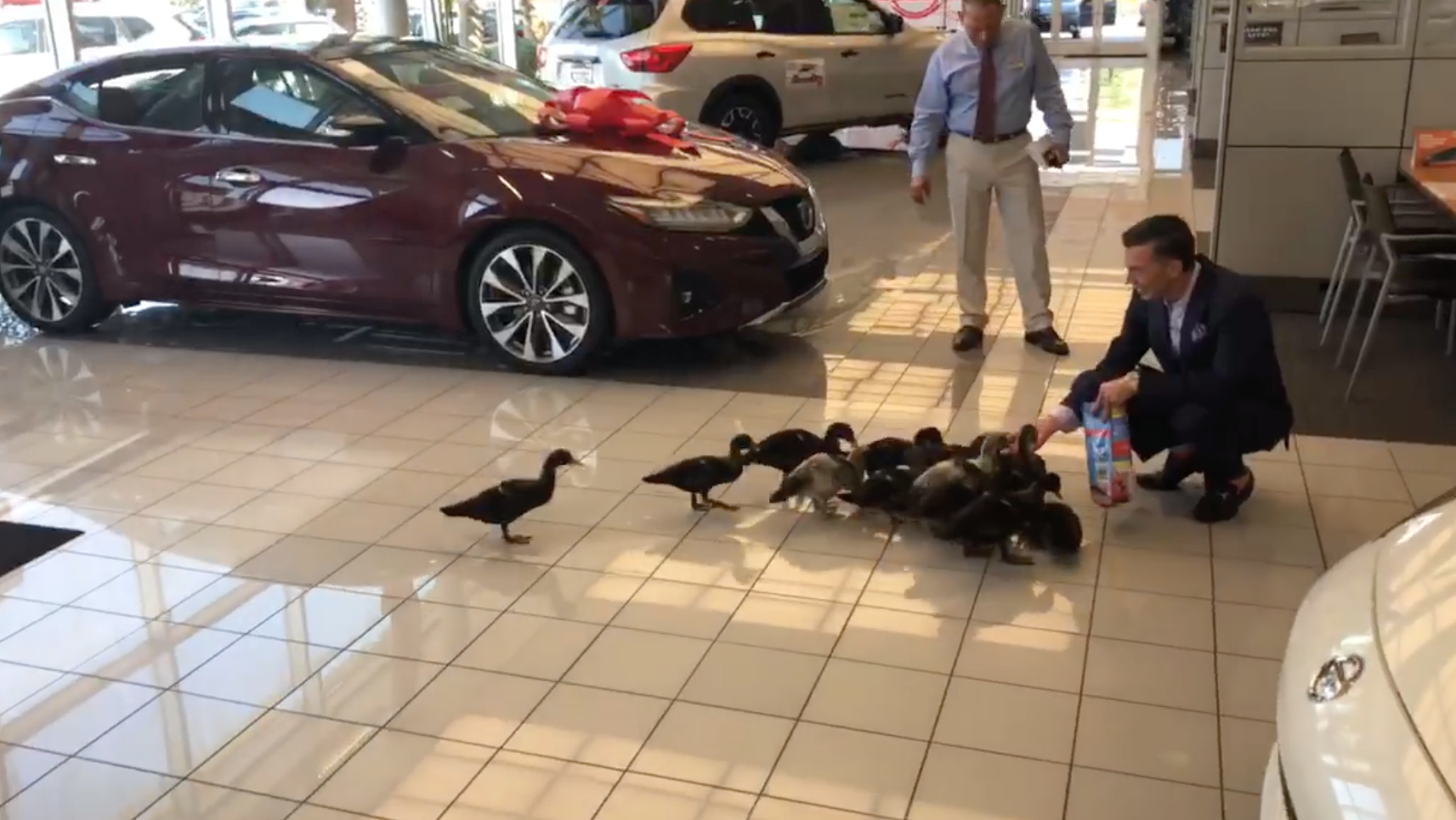 Car dealerships get a bad reputation, and often for good reason. But if there's anything that can break the "stealerships" and don't-forget-valet-mode vibes, it's kindly allowing a family of 16 ducks to move into the showroom.