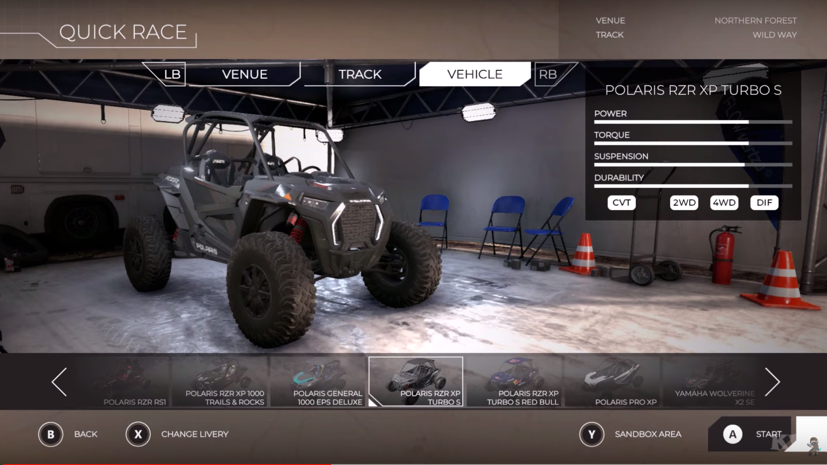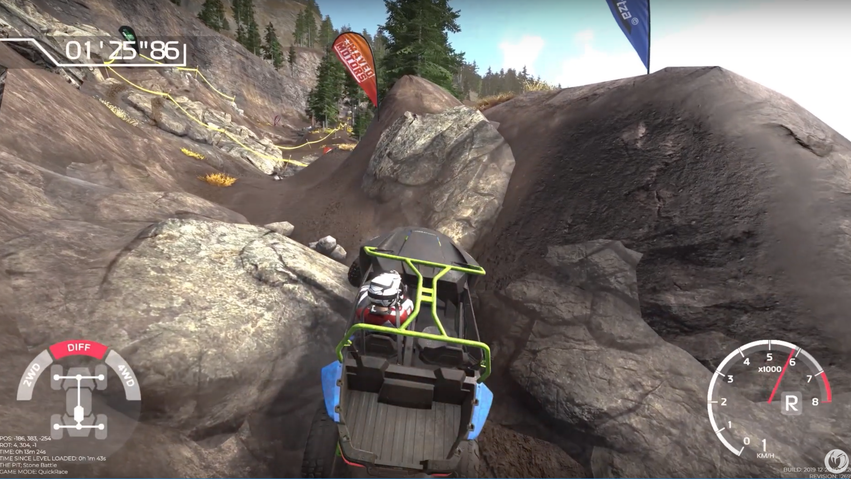 Aside from that and steering, you can manually switch between 2WD and 4WD (though I didn't find any opportunities for 2WD to be advantageous) and UTVs have a differential lock you can activate on the fly to get you through particularly sticky stuff. The diff lock hinders your steering, just like it would in real life, so you'll want to deactivate it for turns. It's neat.