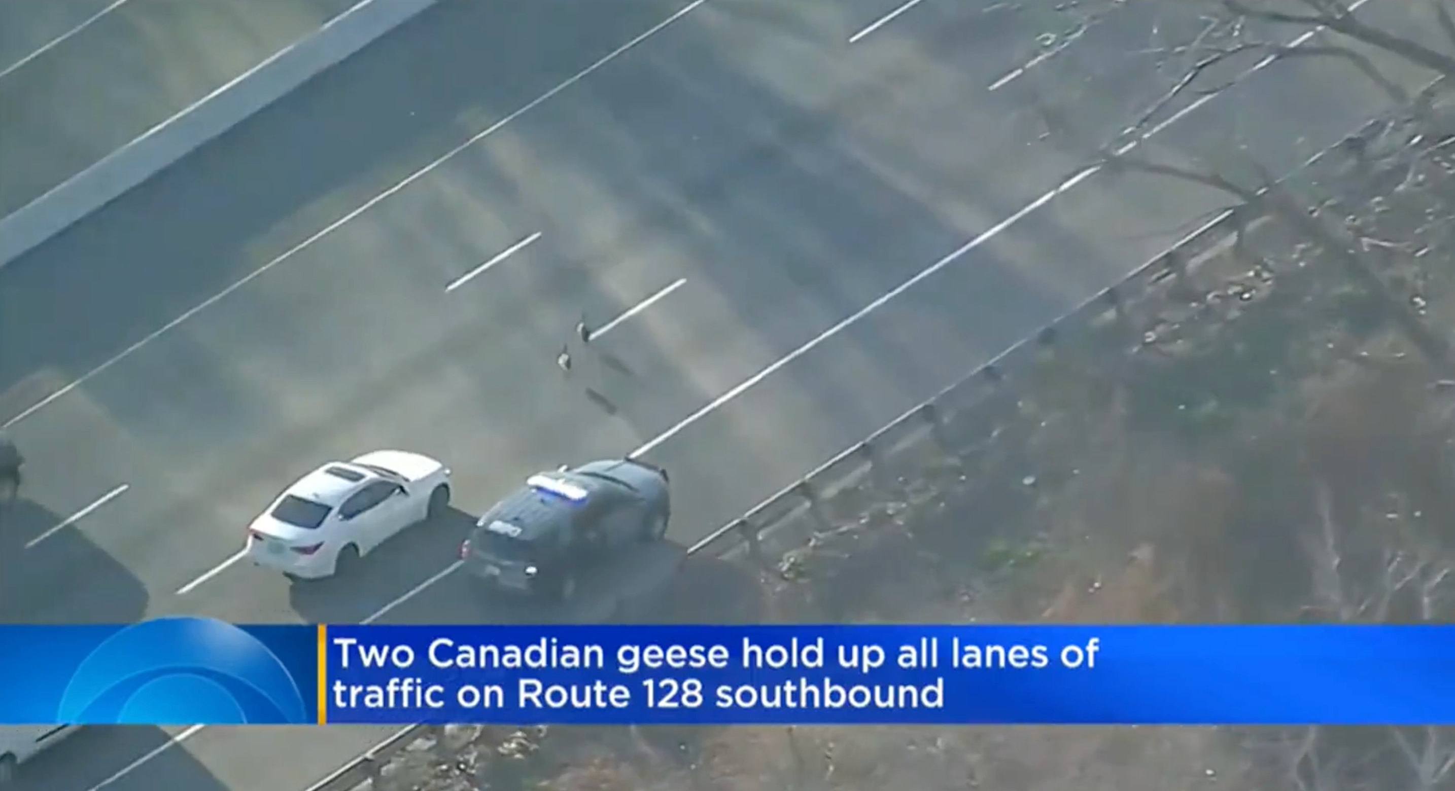 Massachusetts State Police flew into action Wednesday morning when a pair of Canada Geese wandered across Route 128 during morning rush hour in the busy Boston suburb of Wakefield.