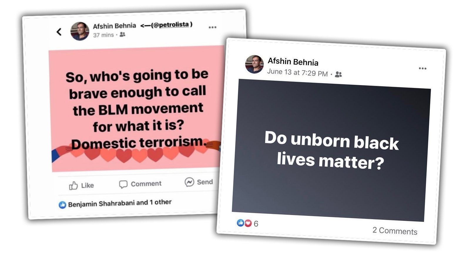 So, in one of these posts, Behnia appears to call the Black Lives Matter movement "Domestic terrorism," which is, I'm going to say, absurd, and then another where he asks "Do unborn black lives matter?" a loaded statement designed to do little more than to enrage and conflate complicated issues.