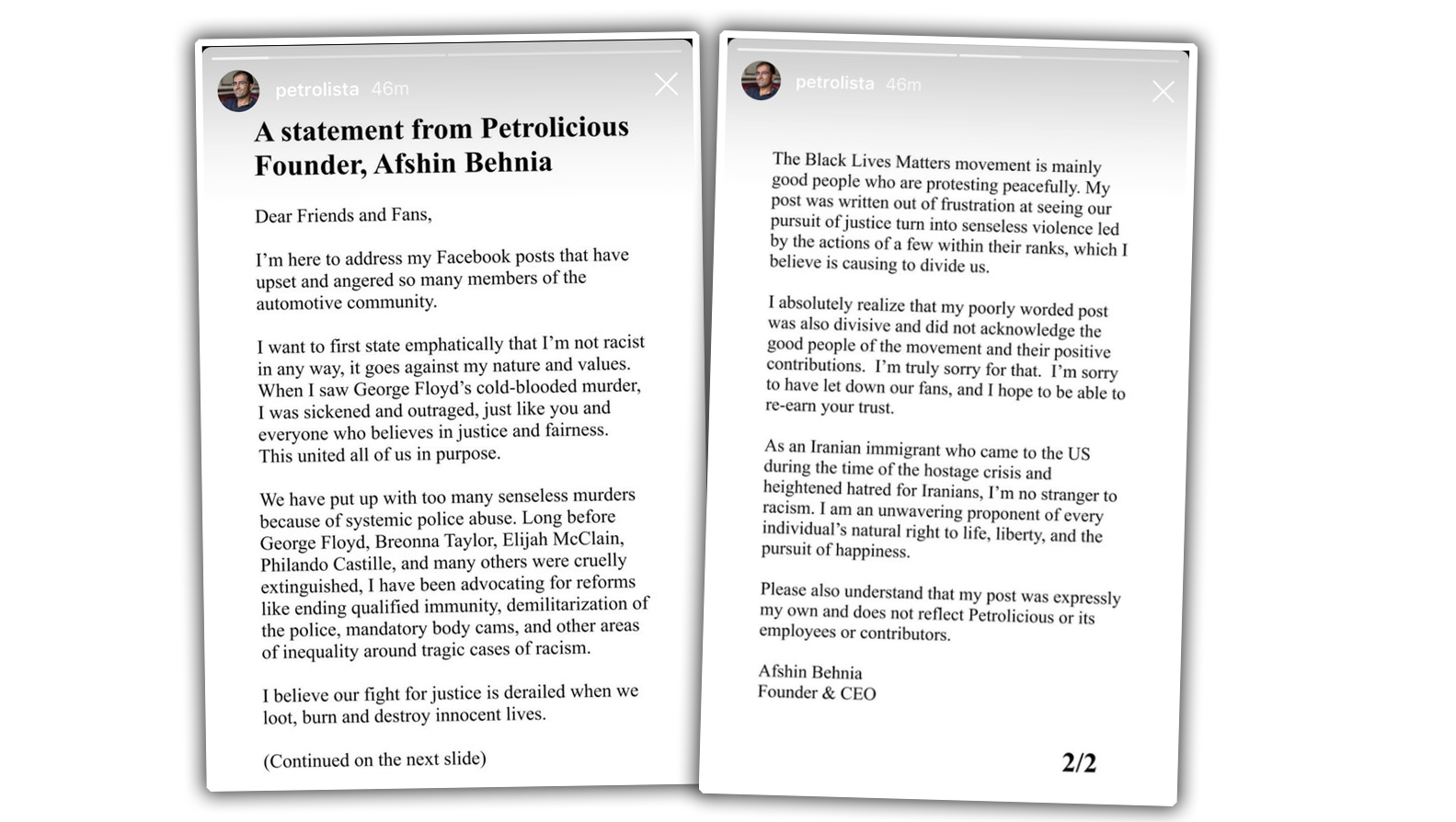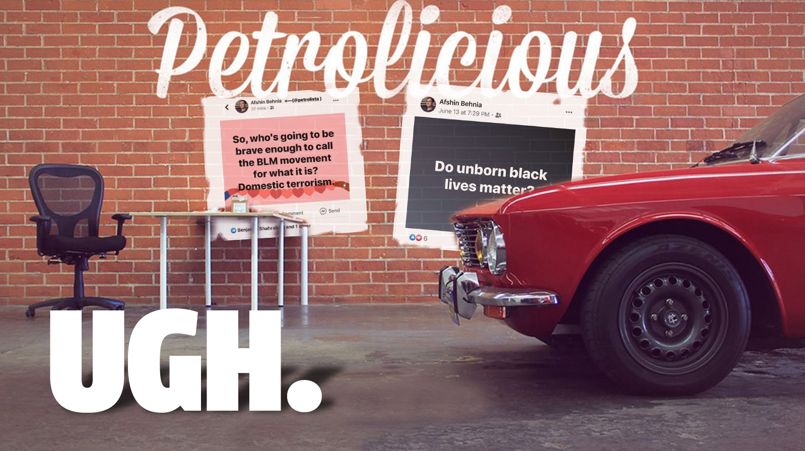 I'm sure nearly all of our readers are at least a little bit familiar with Petrolicious, the car-porn site known for making lovely videos of interesting old cars, and maybe also known for making a bit too-precious videos about rich guys and the cars they bought to seem more interesting. Maybe that's a bit harsh, but it's hard to feel too bad after seeing the sort of racist, tone-deaf crap Petrolicious founder and CEO Afshin Behnia seems to have been posting online.