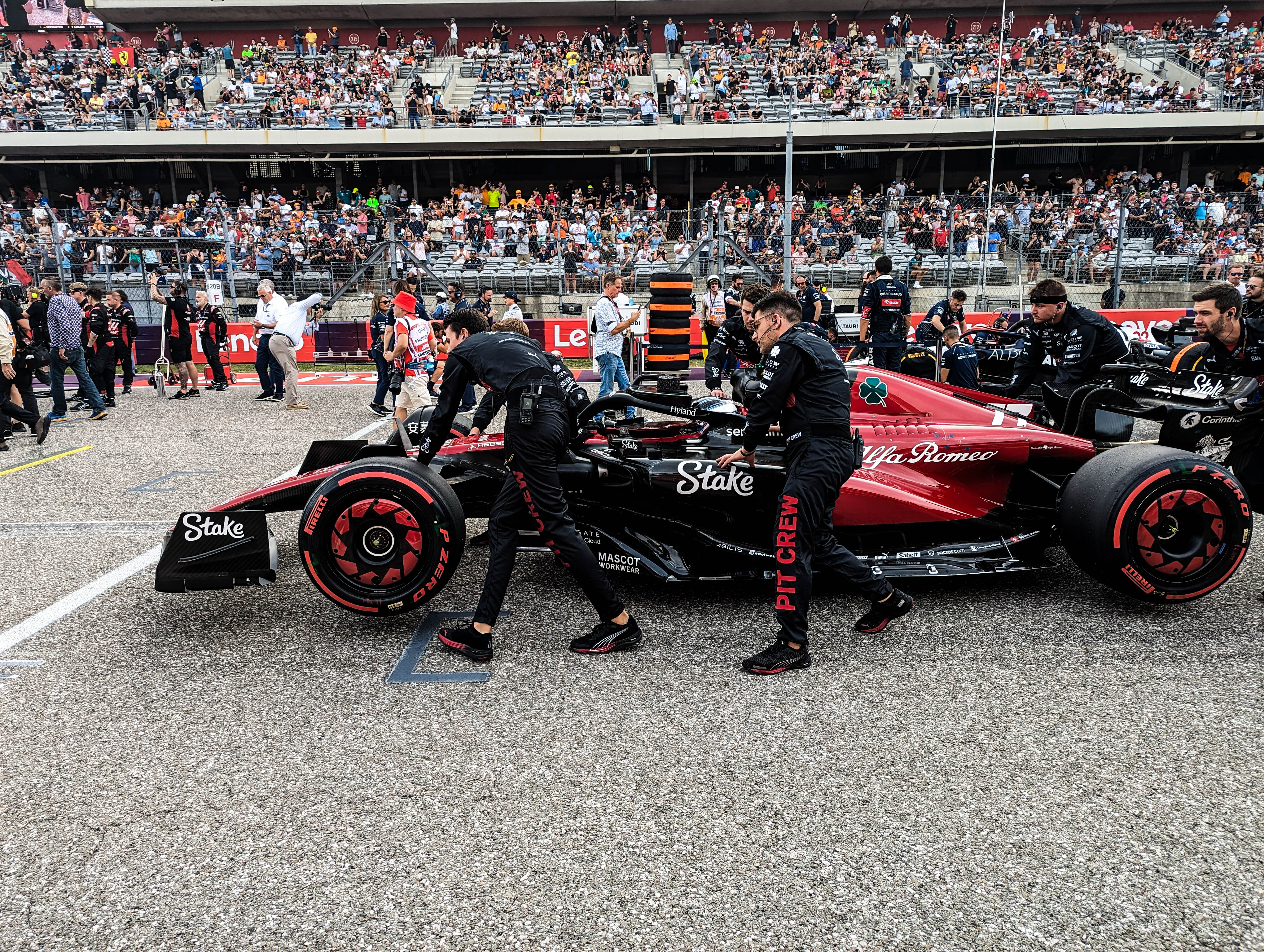 Valtteri Bottas' No. 77 Alfa Romeo is pushed to its grid slot for the 2023 United States GP weekend sprint race.