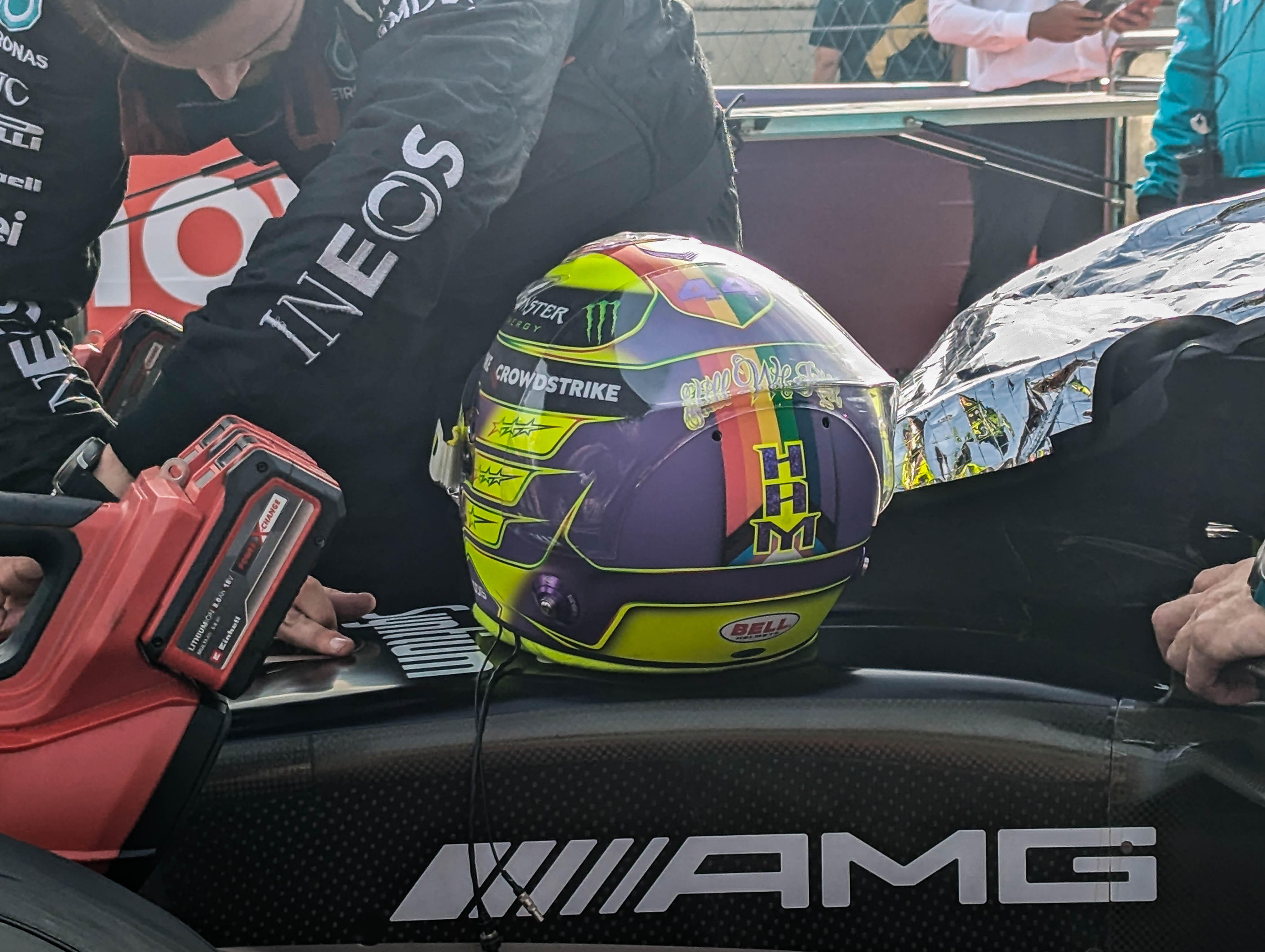 Many drivers chose to tuck their helmets away while waiting for the race to begin. Not so with Lewis Hamilton, who left his iconic lid on display.