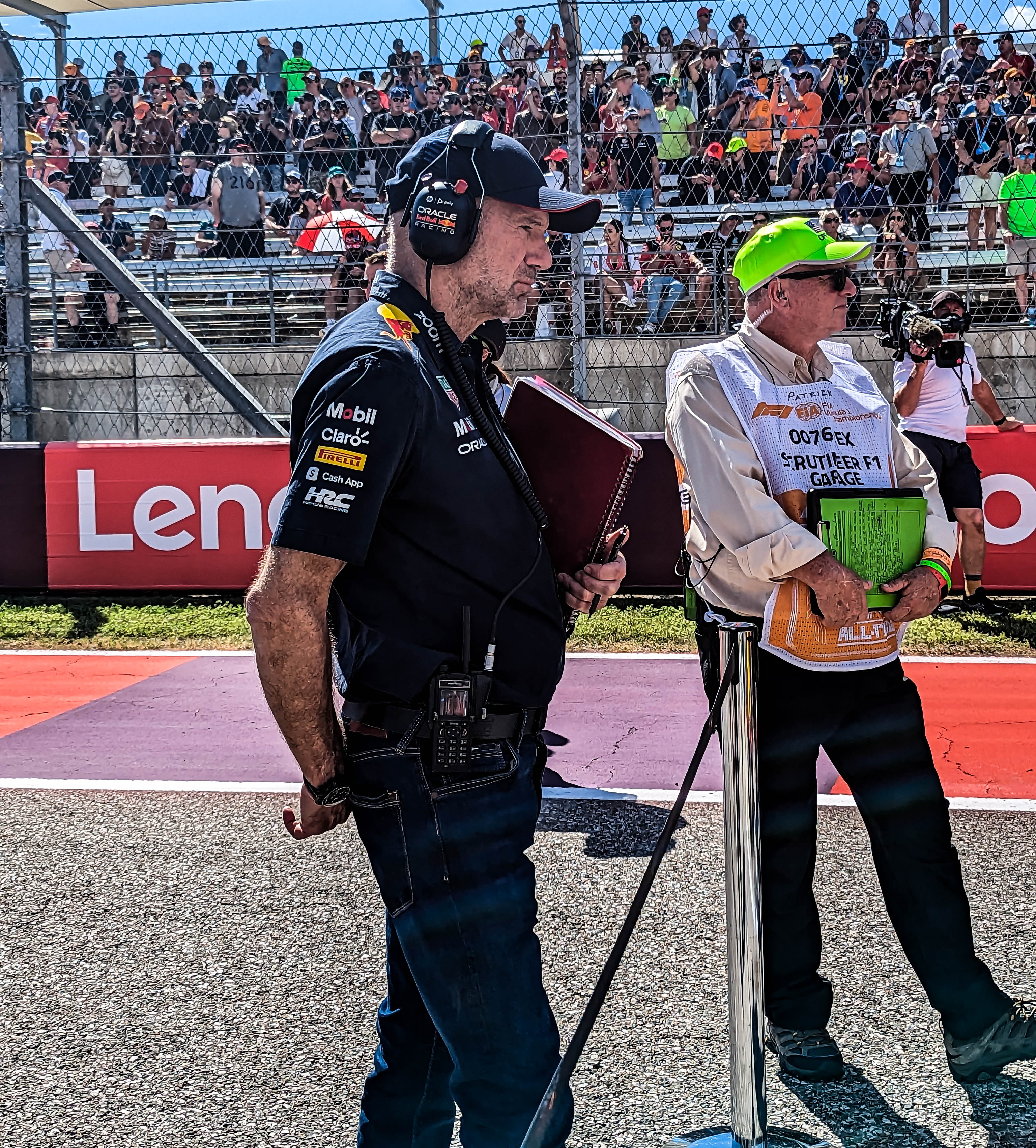 Legendary designer Adrian Newey ponders the No. 11 Red Bull — probably wondering why that car is so damn slow compared to his other machine.