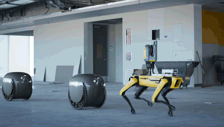 Piaggio Fast Forward created the Gita, a rolling robot that carries cargo, which can now communicate with Spot to create terrifying robot platoons. You can see them marching, which the company actually refers to as Platooning, in this vid: