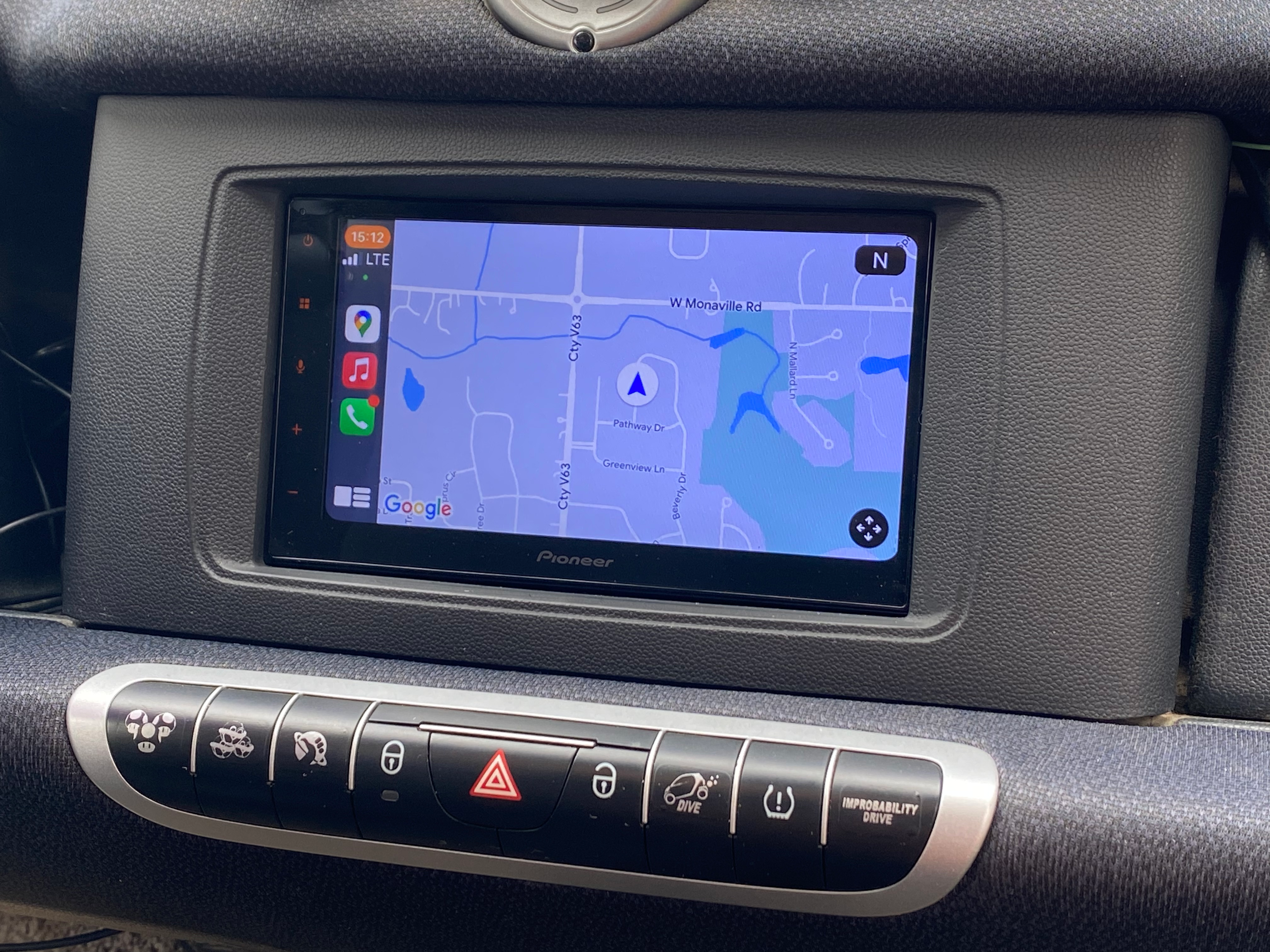 I first installed this head unit into a 2005 Volkswagen Passat TDI wagon for a short spell before installing it into my recently revived 2012 Smart Fortwo. The wiring harness came from Metra with the dash surround kit from Scosche.