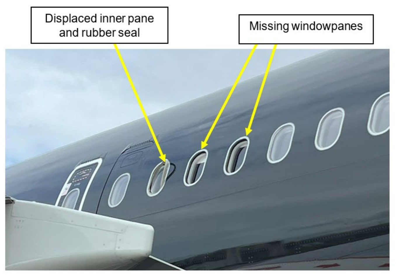 The crew didn't realize that the outer panes on two windows were gone and a third window was coming loose until they were on the ground. On the third window, the rubber seal between the window pane and the fuselage had melted and was peeling out of the frame.