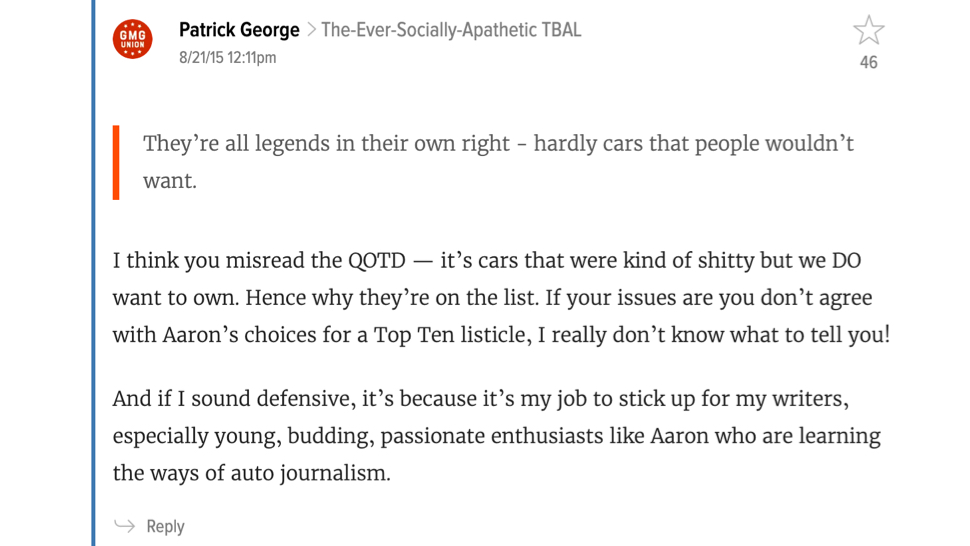 It is nearly impossible to roast Patrick George, as he is one of the only truly nice, dedicated, and normal editors-in-chief Gawker Media has ever had. The rest of them? Very easy to roast, they were all incredibly bizarre people that made you question the existence of a just and loving God. And then there's Patrick, who stood between his staff and a parade of venal morons from both within and without this company with an unyielding strength, while still being a good friend and kind colleague. This isn't because Jalopnik had fewer lunatics on staff than the rest of the sites—the unhinged opinions of many of the staff make that clear. It was just Patrick, who single-handedly forced me to give up some of my hatred for Texas. What are you going to make fun of him for? It's just going to be reference after reference to this, I guess.