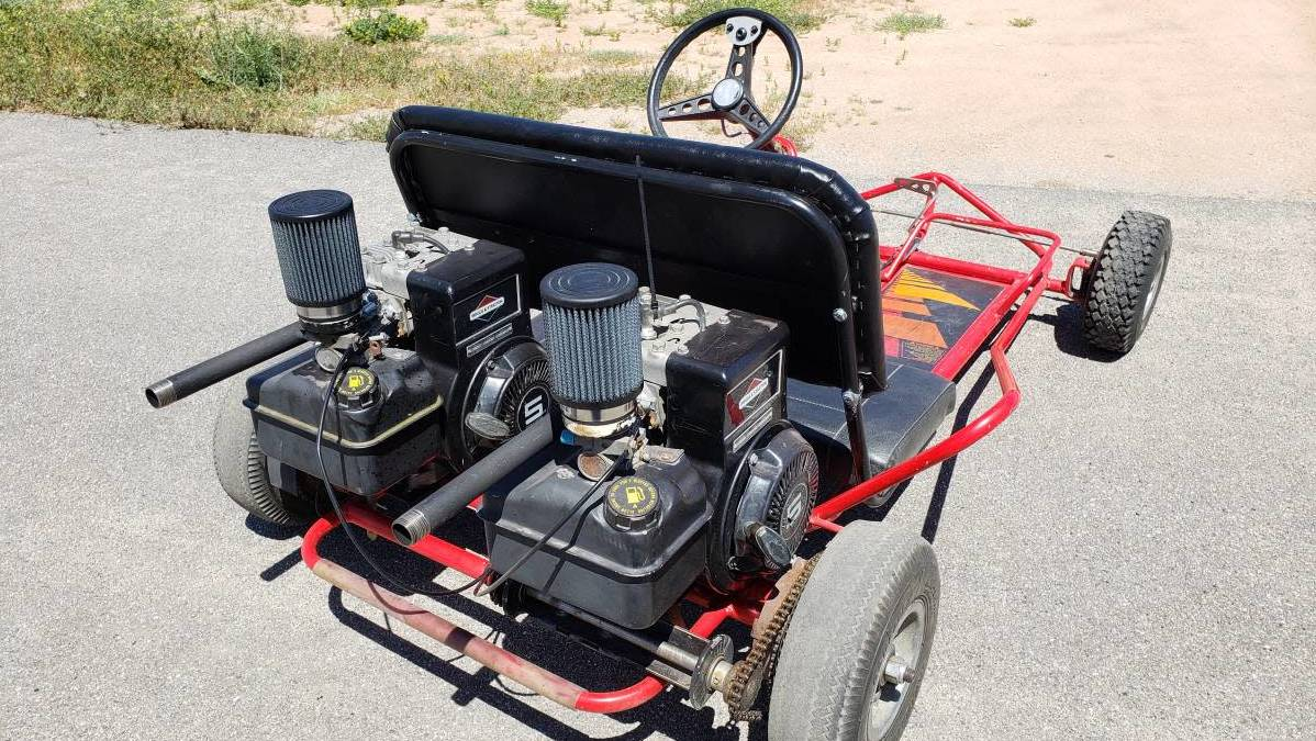 How much power does the average gokart have? You know, like the ones you buy at the big box stores for $599 or whatever and your kids you have it wrecked within the space of the afternoon. Usually no more than a couple, right? The best of them have a 5 horse Briggs. This one has two, count 'em, two Briggs & Stratton 5-horse motors to power the rear wheels. To paraphrase the old Kanye, no one man should have all that power!