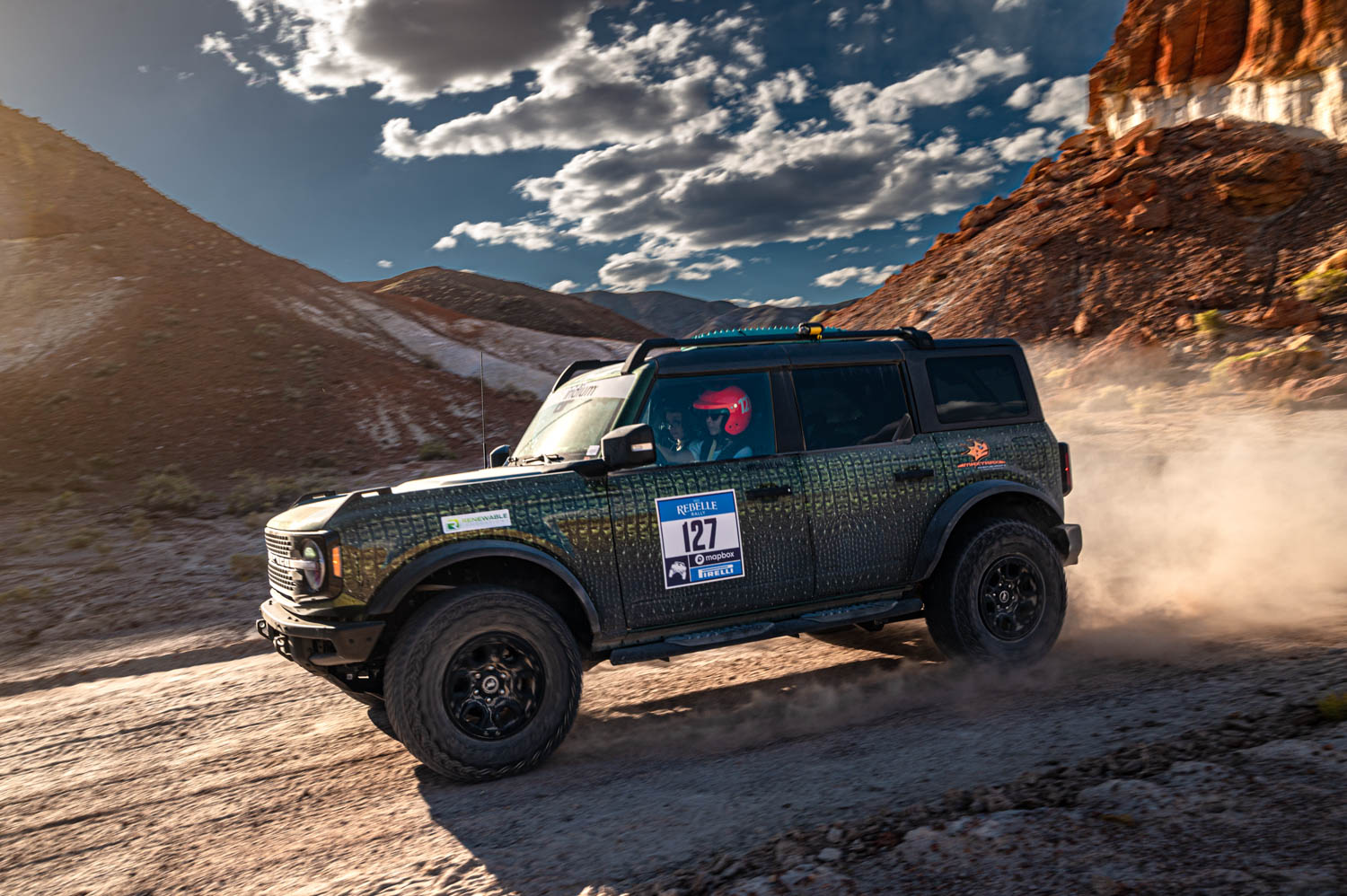 Team 158, driving a 2018 Rubicon Jeep Wrangler JLU, crossed the finish line and showed off what they thought to be a weather balloon they found on the trail during Monday evening's Live Show and mentioned that they saw everything from rainbows to hail while making their way to Base Camp 2. Team 187, one of the three Rivian factory teams, with Rivian employees Lily Marcaruso and Alex Anderson behind the wheel, got a flat on Stage 3 and changed their tire in four minutes, according to Macaruso.