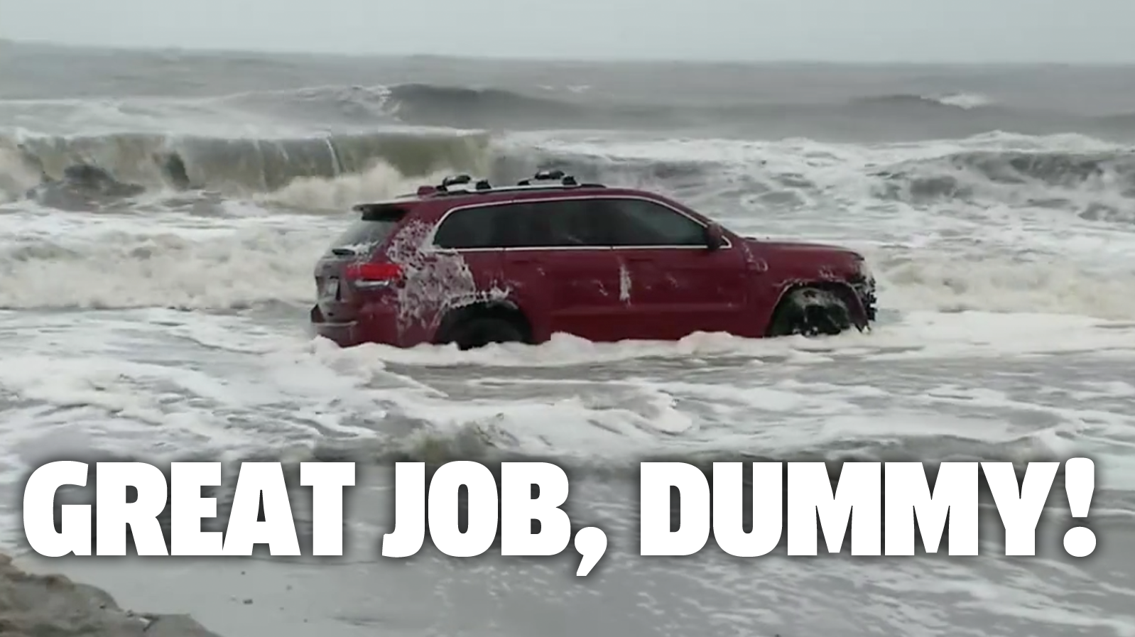 What the hell was this person thinking when they drove onto the beach? That they'd better get the good oceanfront parking to watch the storm before it got too filled up? That's a very stock looking Grand Cherokee, too, with what appear to be just normal all-season tires, hardly the best setup for sandy beach driving.