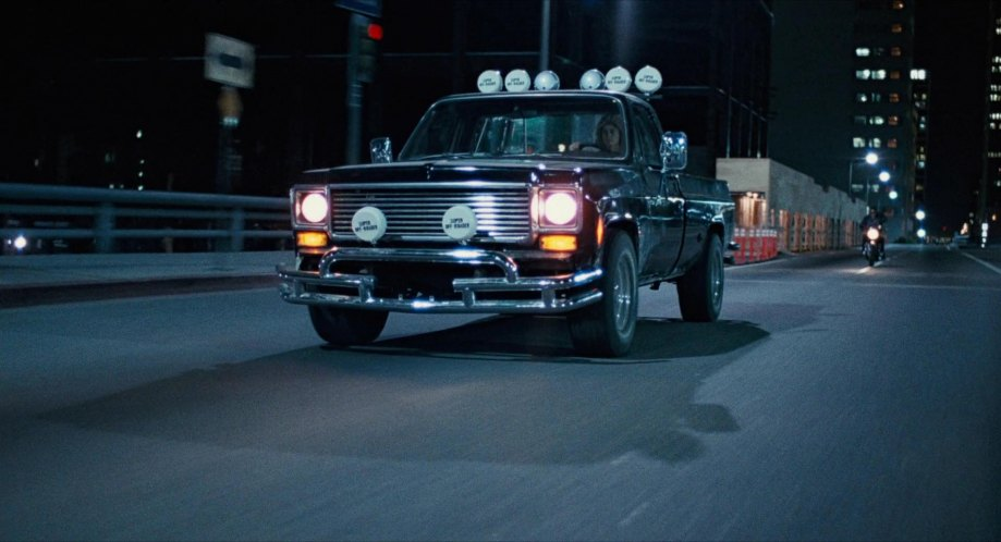 IMCDB lists it as a '73 C-10, though what exactly is not super important, as you can swap around grilles on these things and no great difference is made. The truck is only in one main scene, when Connor and the guy who is not the Terminator but is good and from the future get chased out of a motel and throw pipe bombs at Arnold. That scene is ripped here, but I will include some screenshots that are less likely to get taken down.