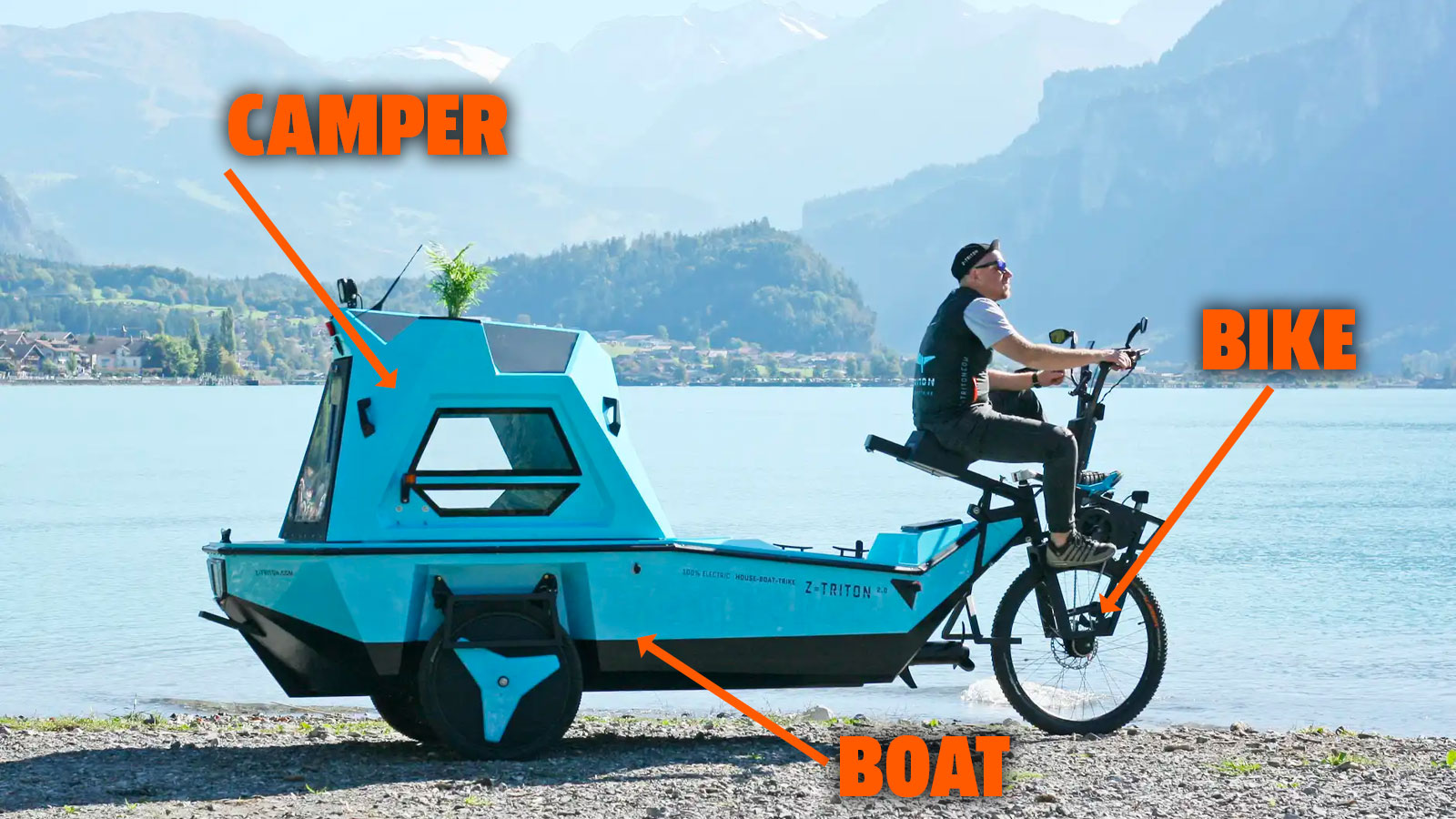 Called the Z-Triton, this three-wheeled, multipurpose machine combines a battery-assisted trike with a small boat, which also doubles as a sleeping area, kitchen and passenger transporter. It can carry two people, one rider and a passenger. The Z-Triton claims to have space for two people to sleep inside.