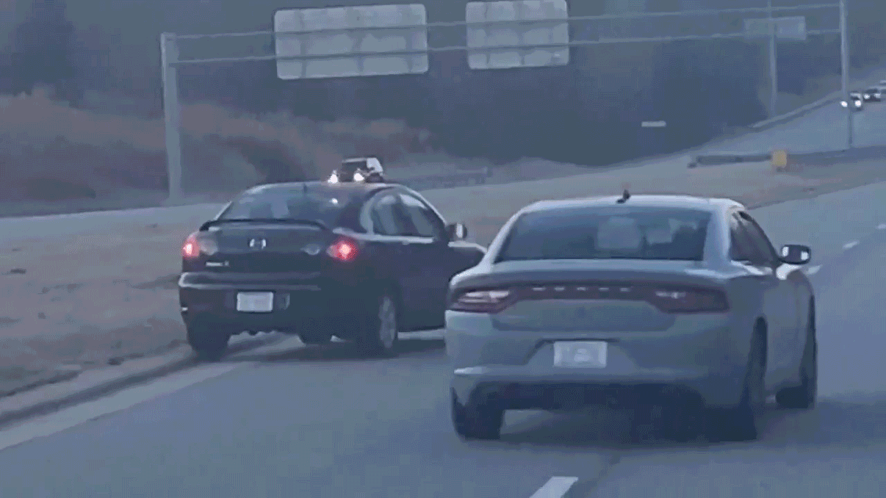 The van driver would follow the Mazda down an interchange off-ramp and pull alongside the black sedan. The Mazda driver throws a drink at the van as the two merge onto another highway. The van closely encroached on the sedan on the highway, and the Mazda driver lost control of their car. An unmarked Dodge Charger police cruiser almost immediately drove into the frame, turned on its lights, and stopped the white van.
