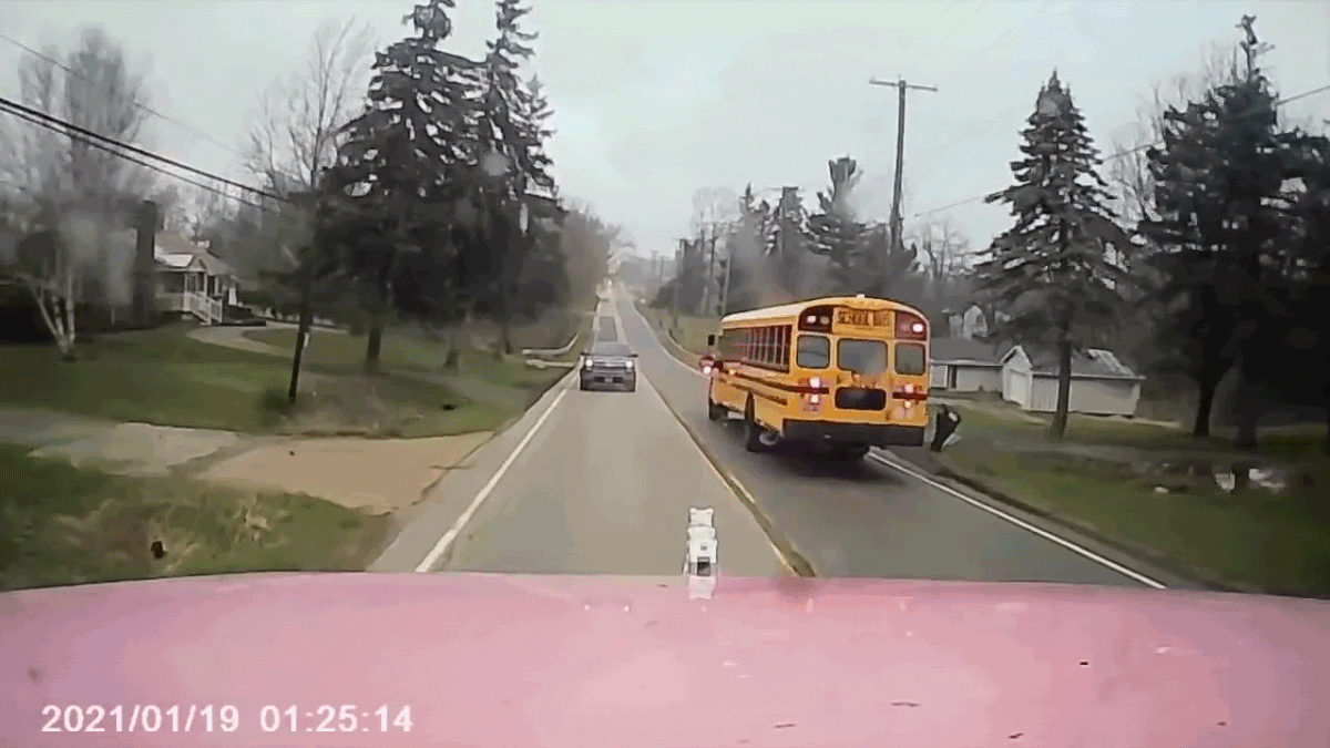 On Tuesday, a school bus was stopped on State Route 57 in Montville, Ohio, 37 miles west of Cleveland. The bus was stopped to pick up students on its route to Ralph E. Waite Elementary School. A pick-up truck and two SUVs were stopped in the opposite lane of the two-lane road, waiting for the school bus to retract its stop sign.